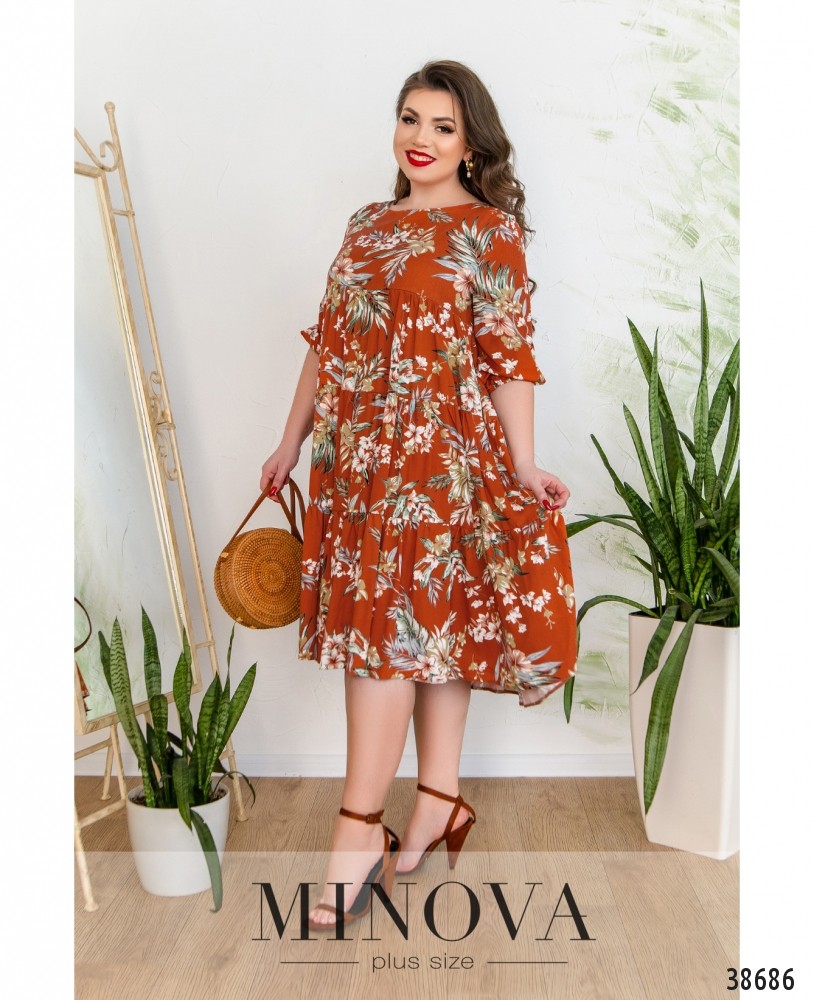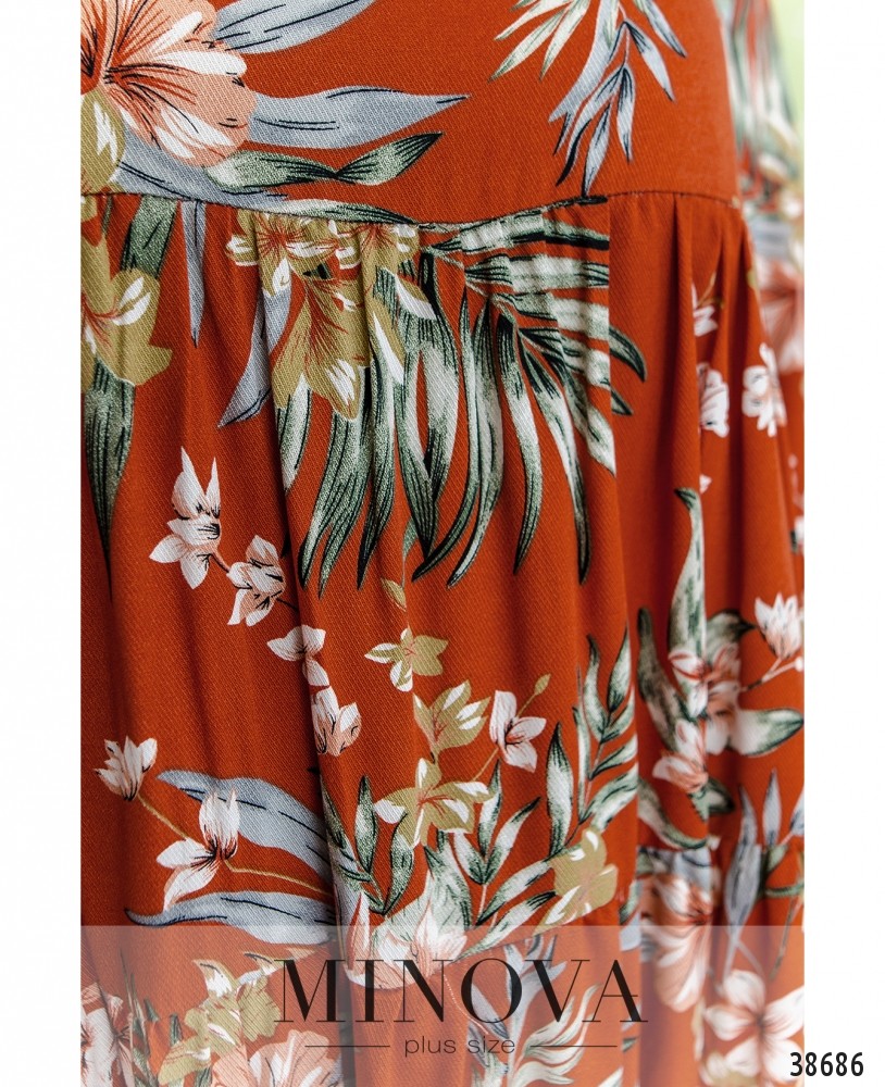 Удобное и яркое повседневное платье с цветочным принтом и с однотонной подкладкой. Рукава без подкладки, в манжеты вшита резинка, карманов и застёжек нет. Верхний слой - с несколькими рядами оборок. Вырез горловины "лодочка".
