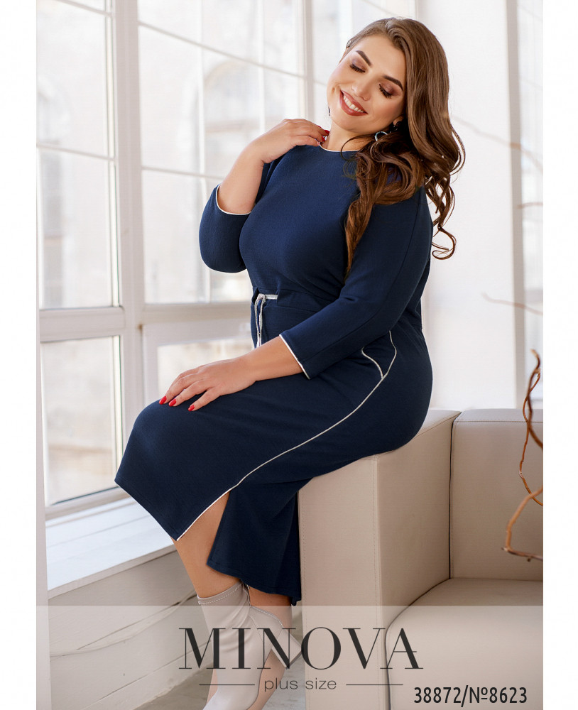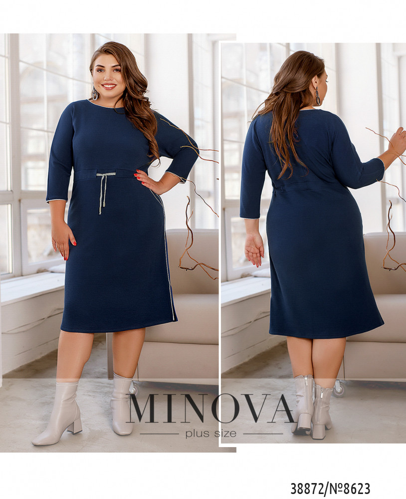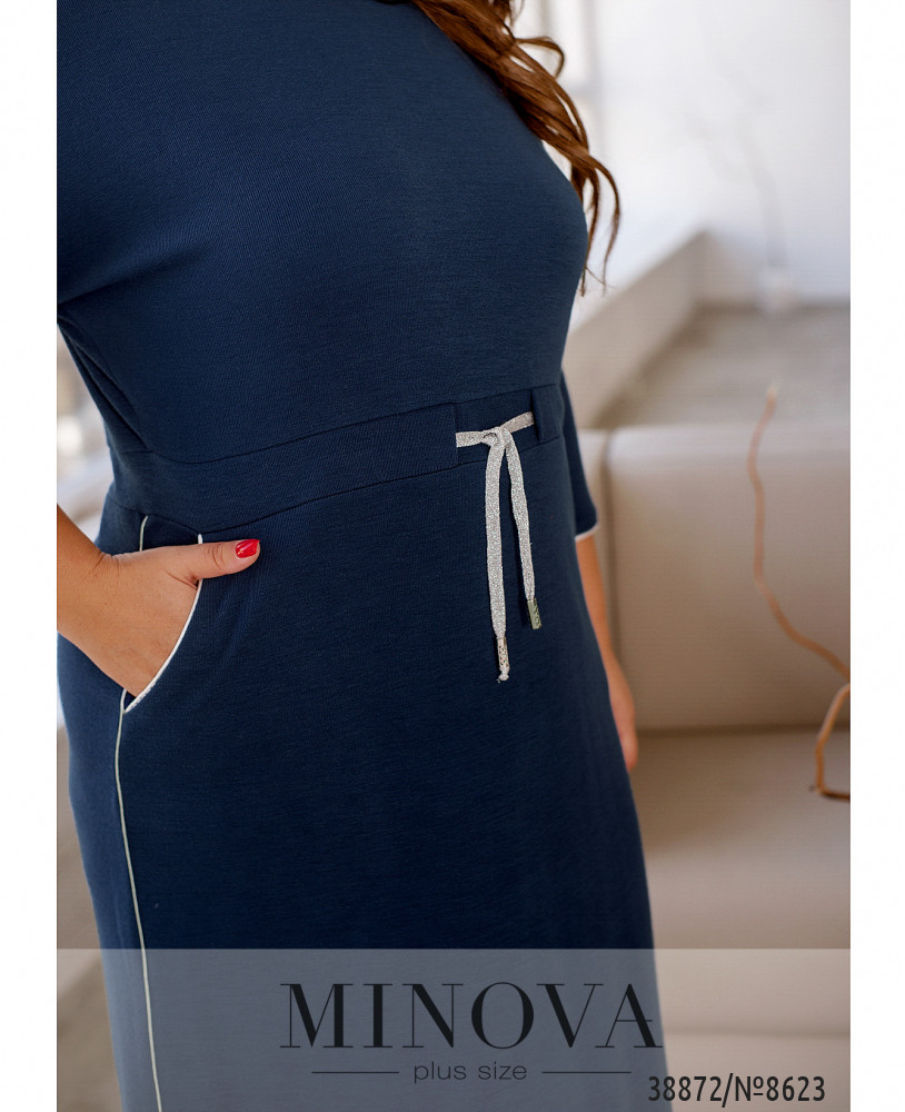 Удобное и нежное повседневное платье батал в минималистичном стиле. Вырез горловины полукруглый, неглубокий. В пояс вшит шнурок. Рукава без манжет, украшены блестящими лентами, такие же ленты - на разрезах по бокам подола. На талии - врезные карманы. Без застёжек.