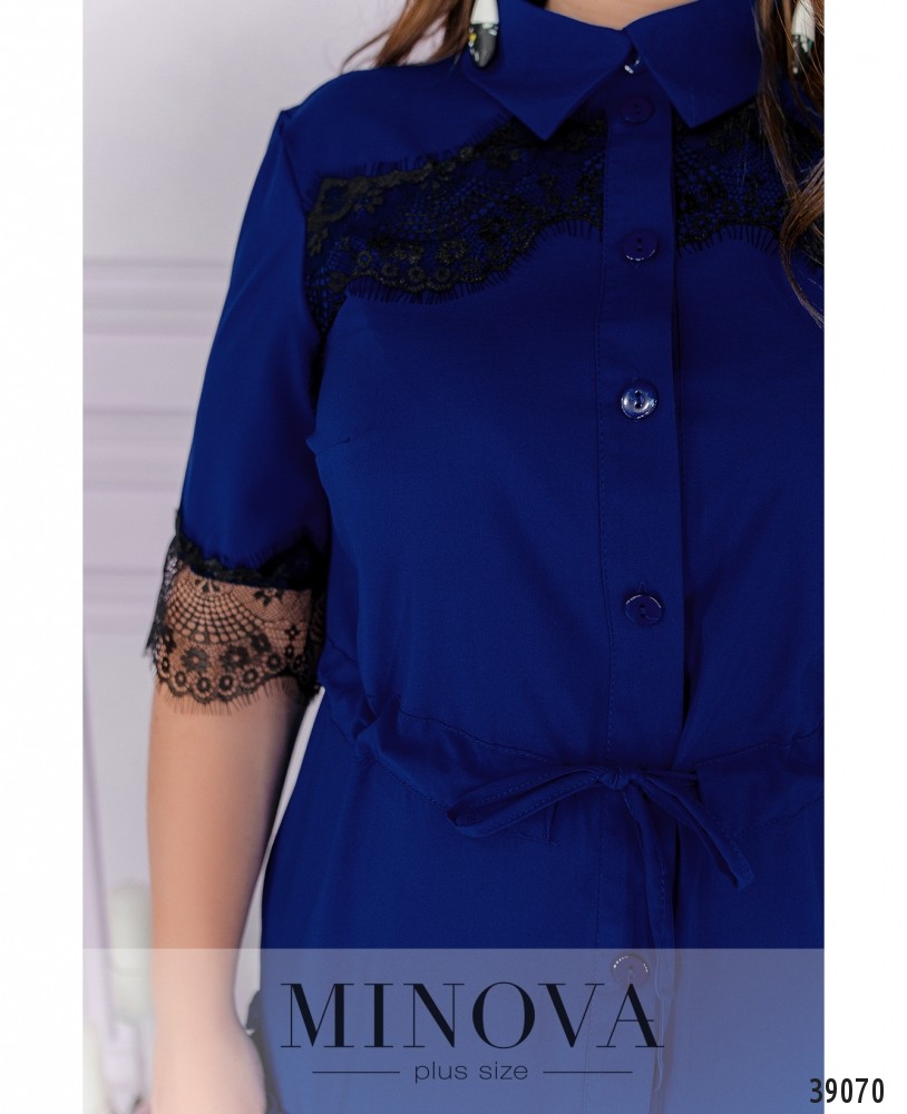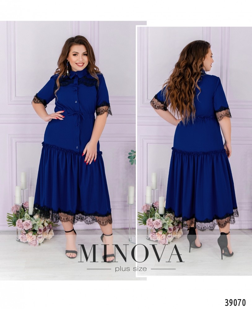Оригинальное платье большого размера А-силуэта, подол украшен мягкими оборками. На рукавах и груди - тонкое кружево. Застёгивается на пуговицы спереди на планке, от отложного воротничка до середины подола. Карманов нет, в пояс вшит шнурок.