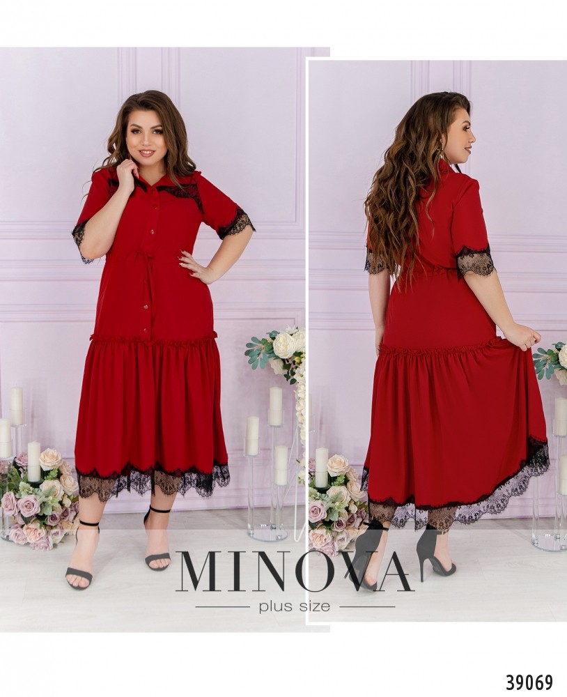Оригинальное платье большого размера А-силуэта, подол украшен мягкими оборками. На рукавах и груди - тонкое кружево. Застёгивается на пуговицы спереди на планке, от отложного воротничка до середины подола. Карманов нет, в пояс вшит шнурок.