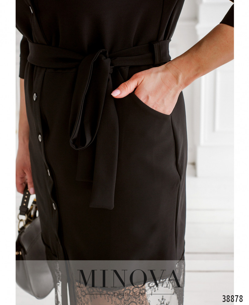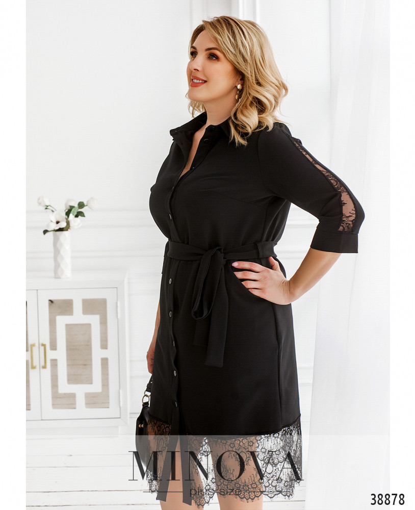 Экстравагантное платье-рубашка большого размера с отложным воротничком, рукава- с небольшими манжетами без пуговиц. Застёгивается на ряд пуговиц спереди на планке. Рукава и подол украшены тонким цветочным кружевом. По бокам - врезные карманы, на груди вытачки. В комплекте пояс в тон. Подол подшит к верху.
