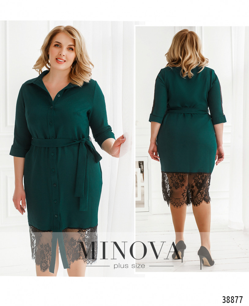 Экстравагантное платье-рубашка большого размера с отложным воротничком, рукава- с небольшими манжетами без пуговиц. Застёгивается на ряд пуговиц спереди на планке. Рукава и подол украшены тонким цветочным кружевом. По бокам - врезные карманы, на груди вытачки. В комплекте пояс в тон. Подол подшит к верху.