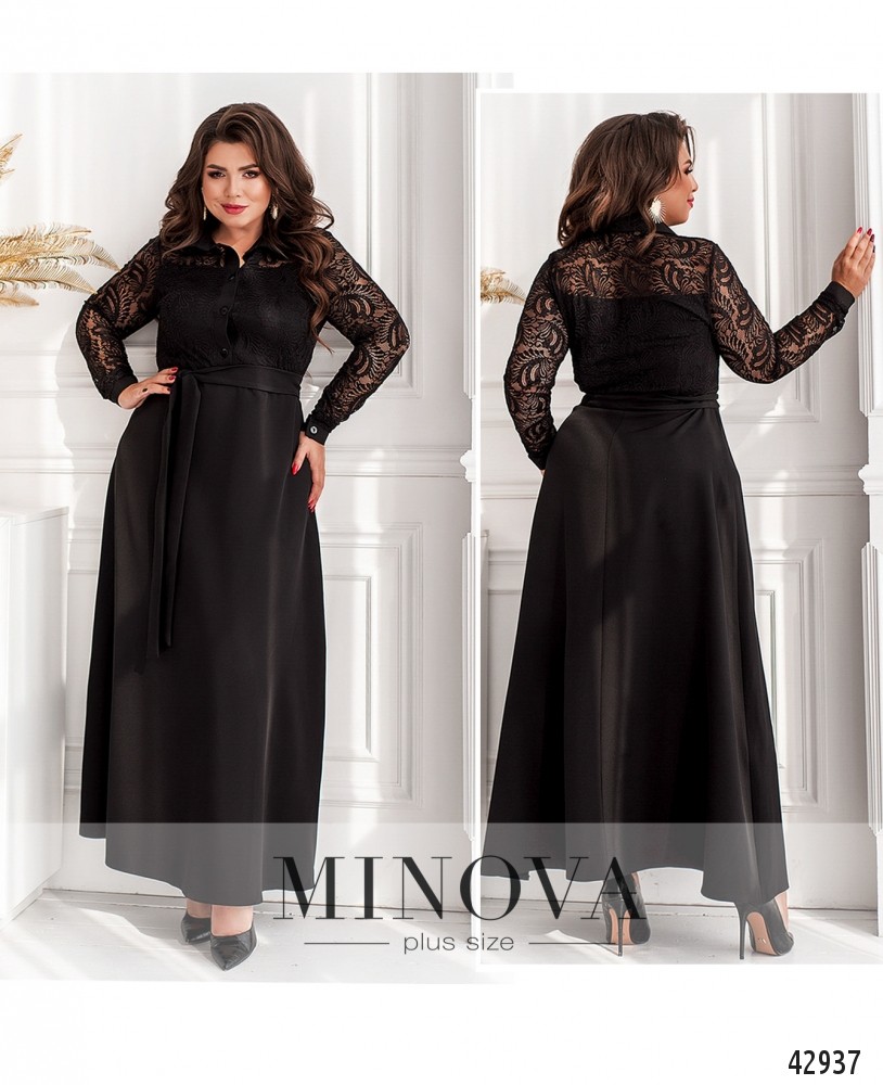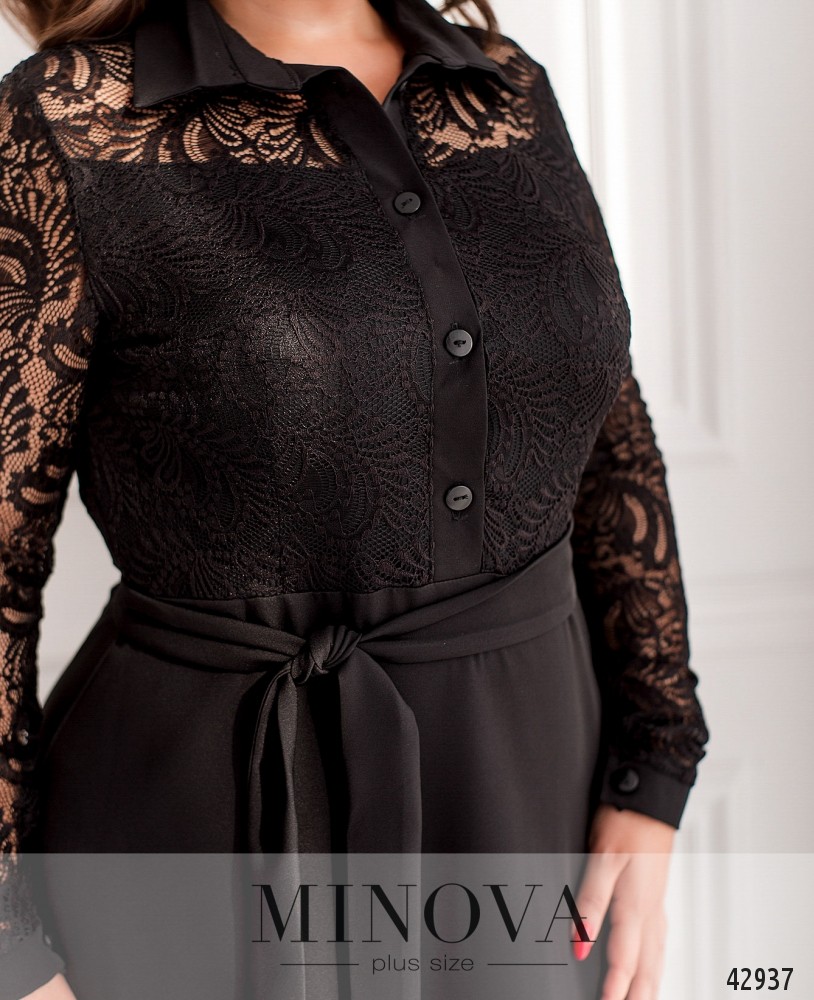 Элегантное платье большого размера с отложным воротничком и рядом пуговиц от воротничка до талии. Лиф украшен полупрозрачным гипюром, от талии до груди изнутри подкладка, а также продольные вытачки. Рукава без подкладки, с плотными манжетами, на манжетах по одной пуговице.