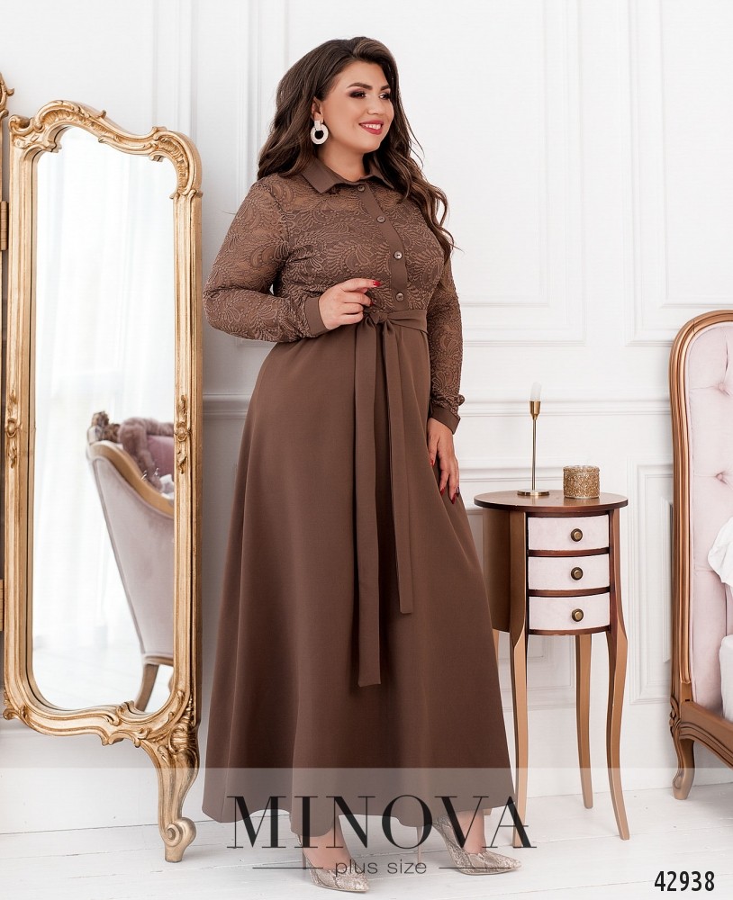 Элегантное платье большого размера с отложным воротничком и рядом пуговиц от воротничка до талии. Лиф украшен полупрозрачным гипюром, от талии до груди изнутри подкладка, а также продольные вытачки. Рукава без подкладки, с плотными манжетами, на манжетах по одной пуговице.
