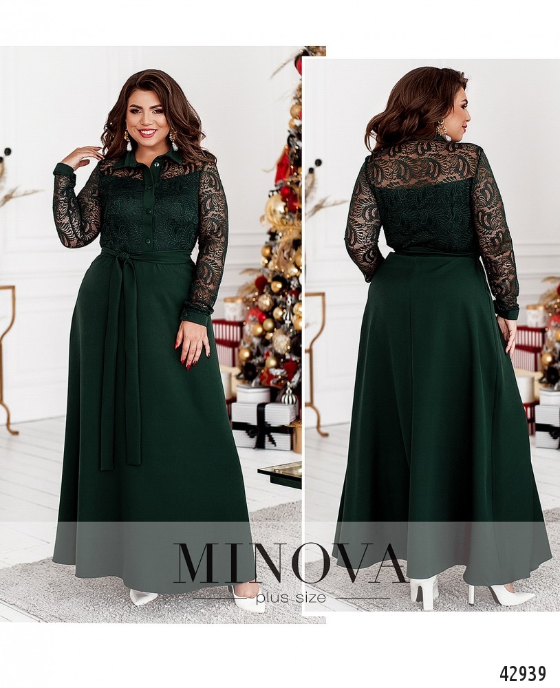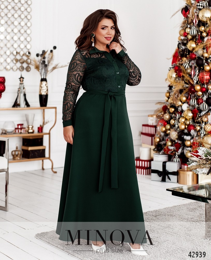 Элегантное платье большого размера с отложным воротничком и рядом пуговиц от воротничка до талии. Лиф украшен полупрозрачным гипюром, от талии до груди изнутри подкладка, а также продольные вытачки. Рукава без подкладки, с плотными манжетами, на манжетах по одной пуговице.