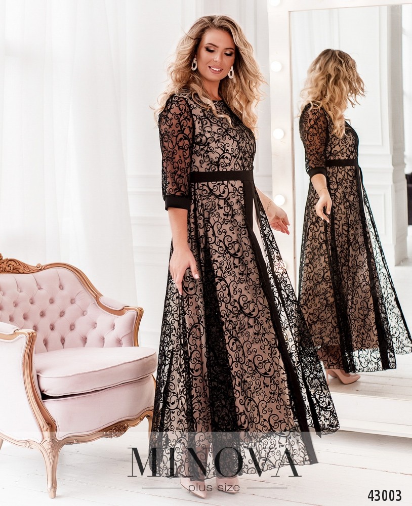 Нарядное платье батал без карманов, с потайной змейкой по спинке, с полукруглым вырезом горловины. Нижний слой мягкий, верхний - полупрозрачный узорчатый гипюр. Рукава без подкладки, с уплотнённым манжетом. Верхний слой на подоле подшит на талии, при ходьбе развевается, оторочен по краю разреза спереди плотной лентой.