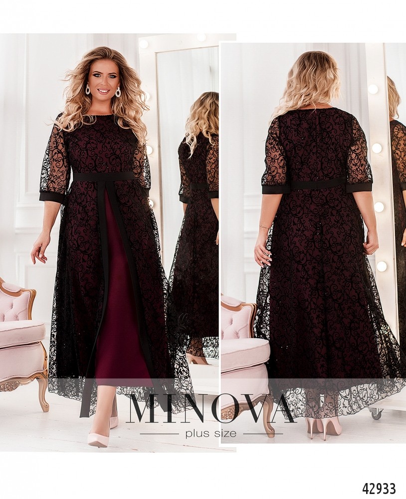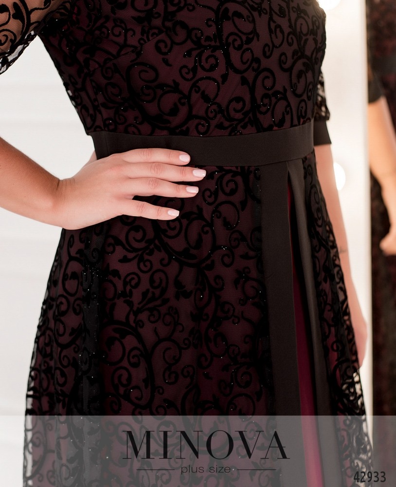 Нарядное платье батал без карманов, с потайной змейкой по спинке, с полукруглым вырезом горловины. Нижний слой мягкий, верхний - полупрозрачный узорчатый гипюр. Рукава без подкладки, с уплотнённым манжетом. Верхний слой на подоле подшит на талии, при ходьбе развевается, оторочен по краю разреза спереди плотной лентой.