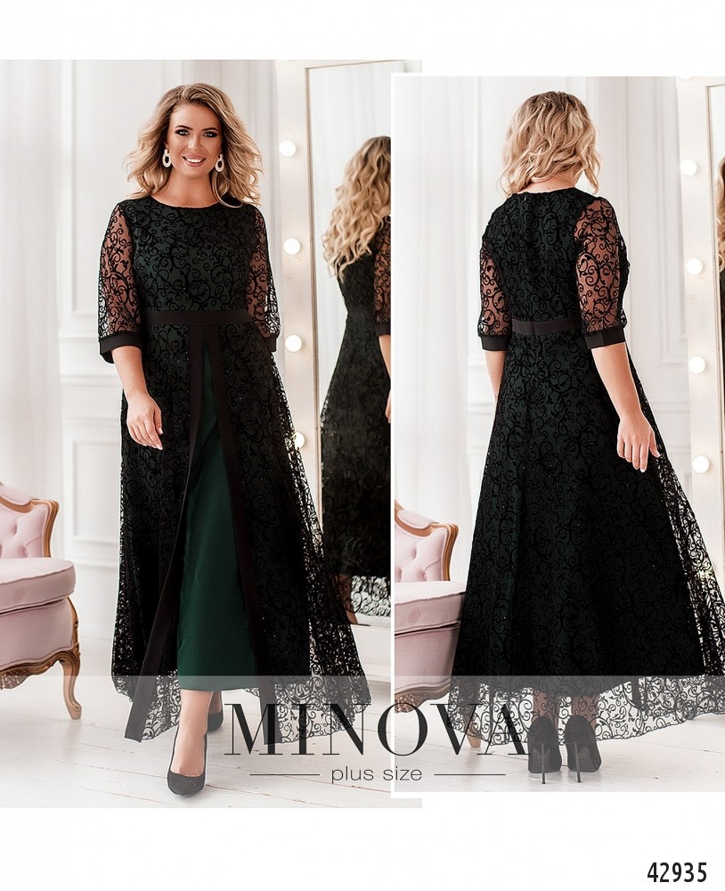Нарядное платье батал без карманов, с потайной змейкой по спинке, с полукруглым вырезом горловины. Нижний слой мягкий, верхний - полупрозрачный узорчатый гипюр. Рукава без подкладки, с уплотнённым манжетом. Верхний слой на подоле подшит на талии, при ходьбе развевается, оторочен по краю разреза спереди плотной лентой.