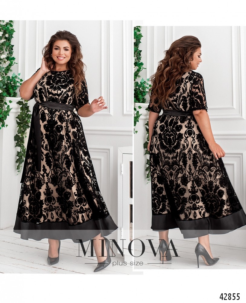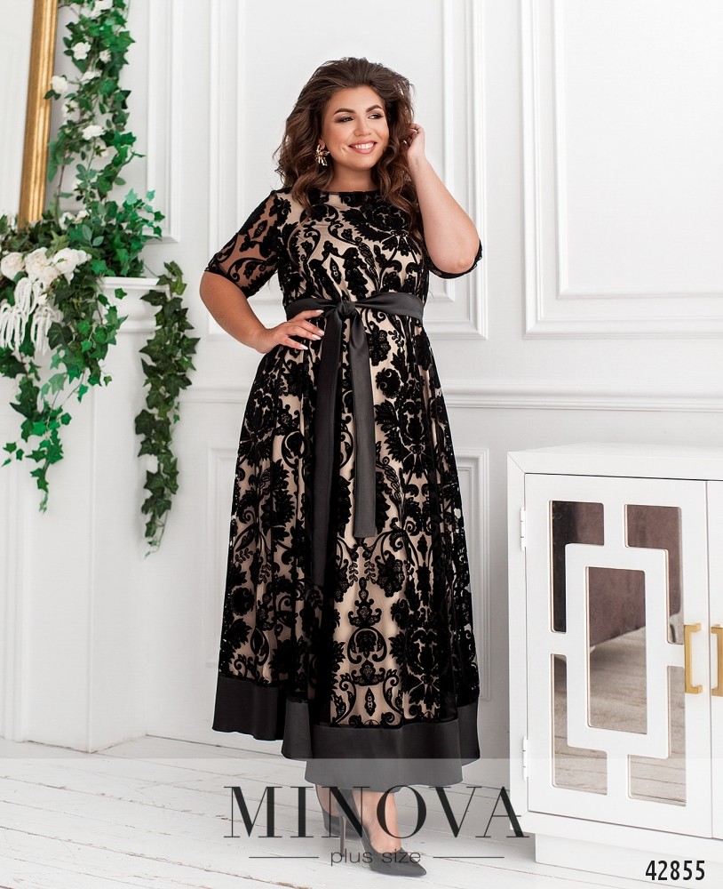 Элегантное платье плюс сайз с гладким длинным поясом. Платье А-силуэта, без застёжек и карманов, с полукруглым вырезом горловины. Нижний слой мягкий, верхний подшит на горловине, цветочный гипюр. Рукава без подкладки, с небольшими манжетами-оборками, в которые вшита резинка.