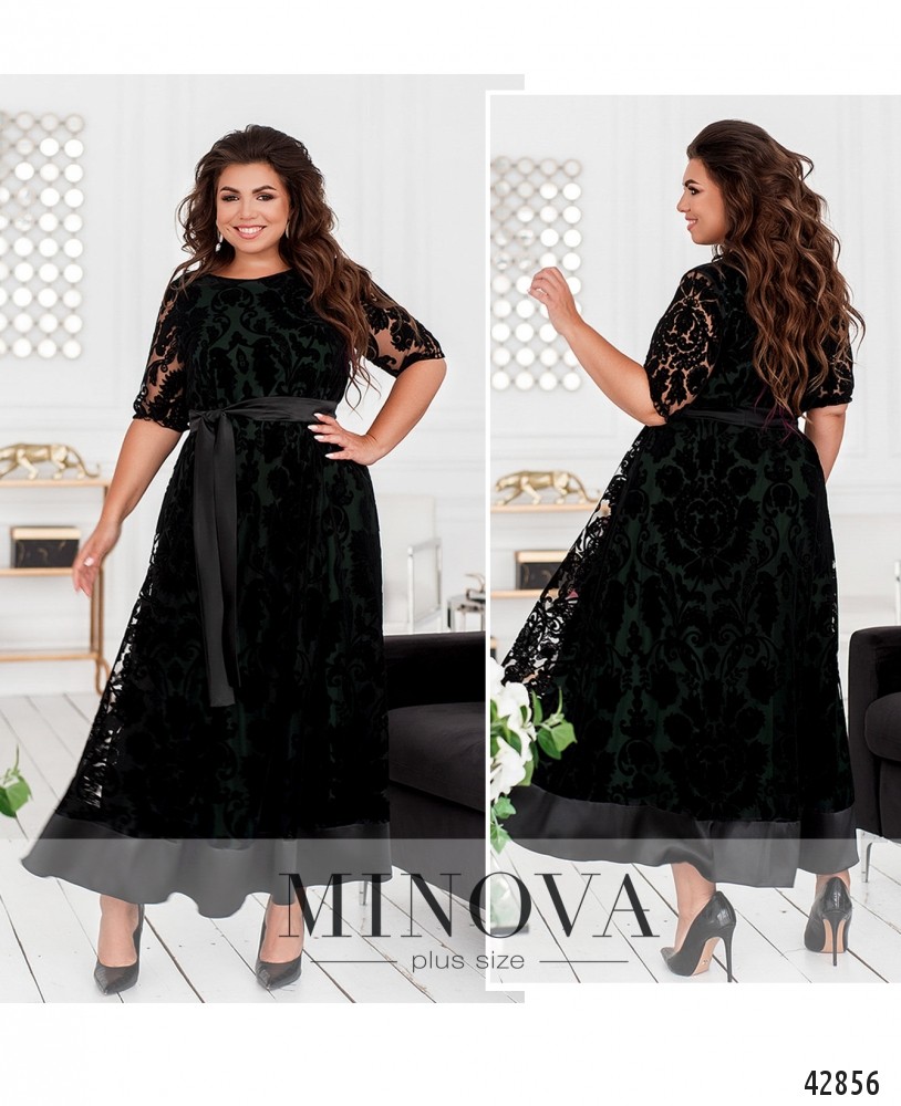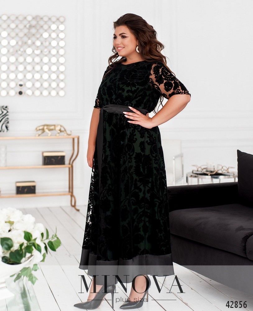 Элегантное платье плюс сайз с гладким длинным поясом. Платье А-силуэта, без застёжек и карманов, с полукруглым вырезом горловины. Нижний слой мягкий, верхний подшит на горловине, цветочный гипюр. Рукава без подкладки, с небольшими манжетами-оборками, в которые вшита резинка.