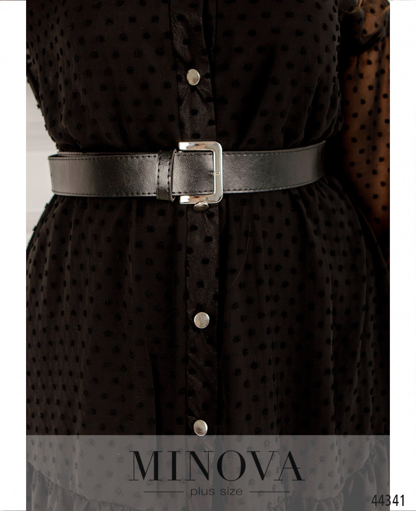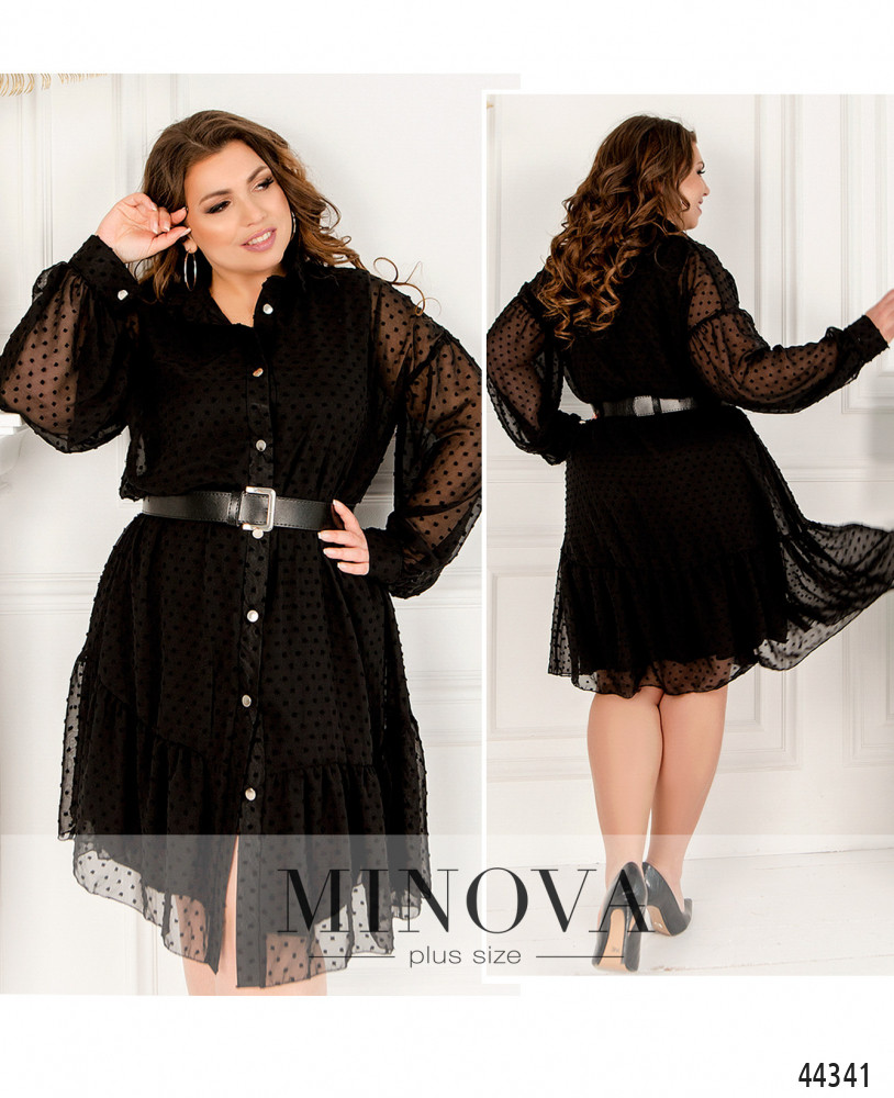 Элегантное и нежное платье батал с отложным воротничком, застёгивается на ряд пуговиц спереди на планке, от отложного воротничка до низу. Подол внизу украшен оборками. Рукава заужены к манжету, на манжетах по одной пуговице. Карманов нет. Под полупрозрачным верхом - мягкая подкладка (кроме рукавов).