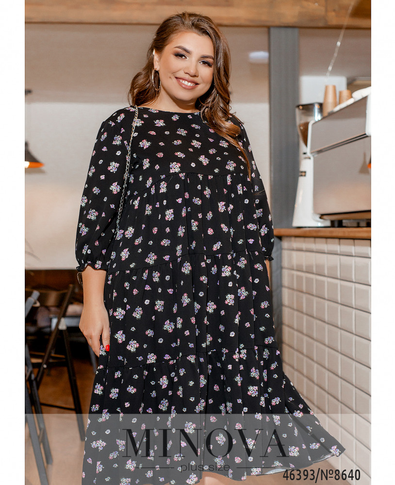 Нежное женственное платье А-силуэта с несколькими рядами воздушных оборок – универсальное решение для любой модницы. В нем вполне можно появиться как в офисе, так и на корпоративе или празднике. Застёжек и карманов нет, вырез горловины полукруглый, в рукава на месте манжет вшиты тонкие резинки.