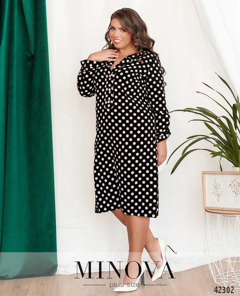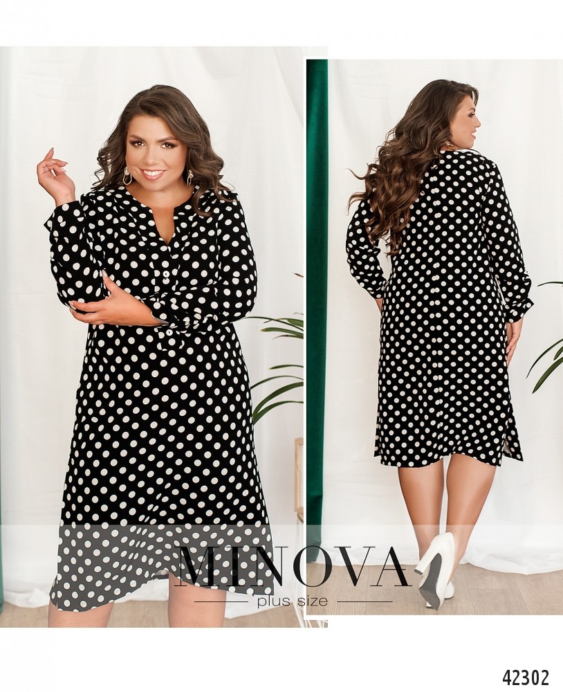 Нарядное платье батал в горошек, рукава с присобранной тканью на месте манжет, на груди вытачки. По бокам подола - разрезы. Застёгивается на три пуговицы. Карманов нет.