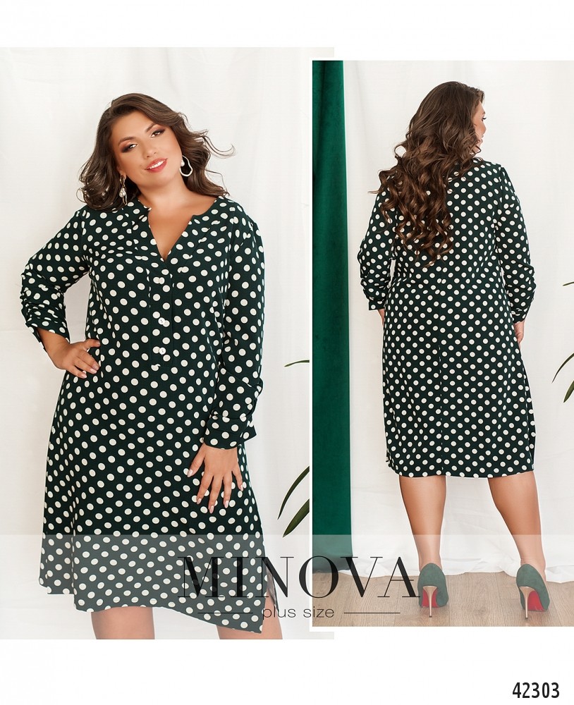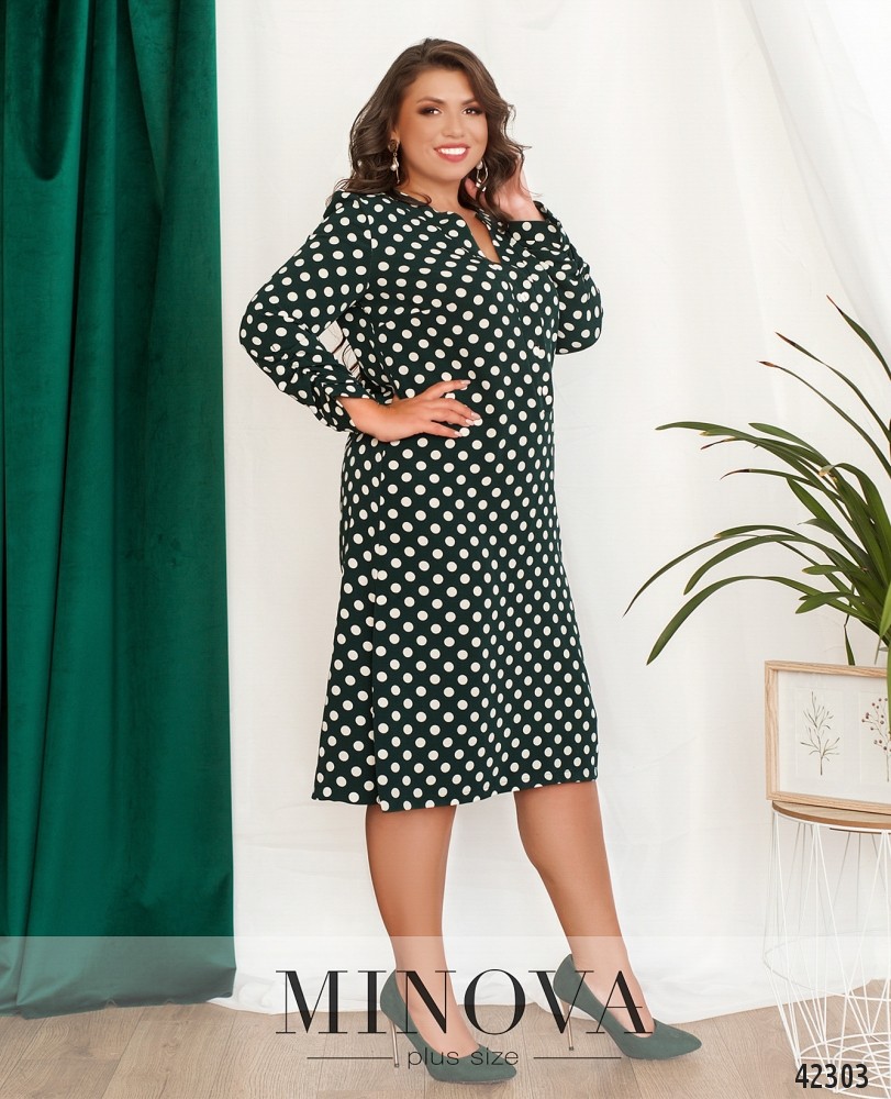 Нарядное платье батал в горошек, рукава с присобранной тканью на месте манжет, на груди вытачки. По бокам подола - разрезы. Застёгивается на три пуговицы. Карманов нет.