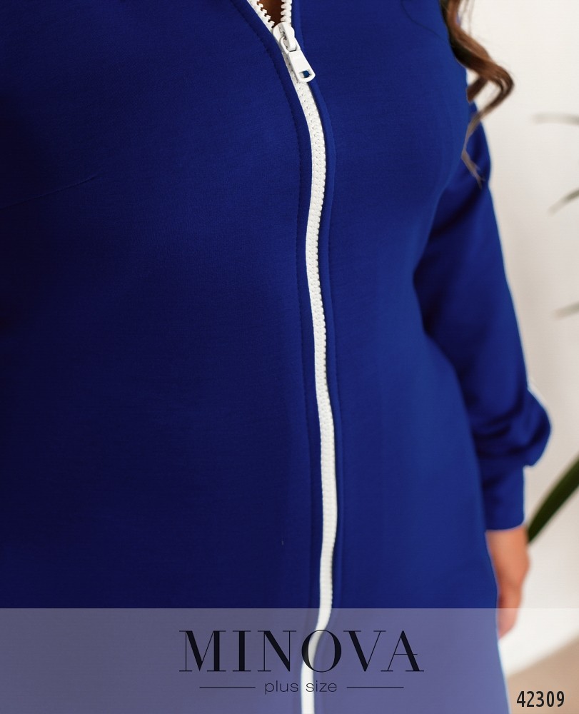 Удобное длинное платье батал с продольной молнией по центру. Молния с двумя бегунками. По бокам - врезные карманы. На рукавах лампасы. Воротник мягкий. На груди вытачки. Рукава с мягкими манжетами.