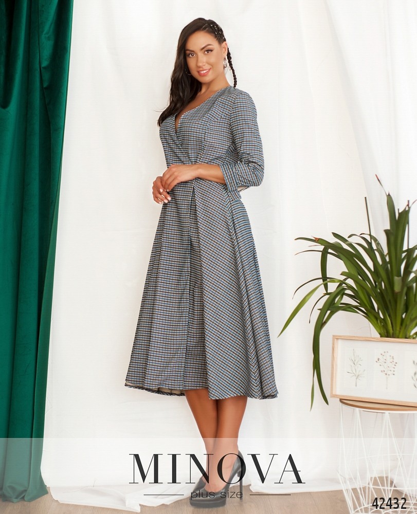 Клетчатое платье батал в стиле двубортного пальто, застёгивается на две пуговицы на запАх. Карманов нет, подкладки тоже нет. Рукава с небольшими манжетами, на манжетах по одной пуговице.