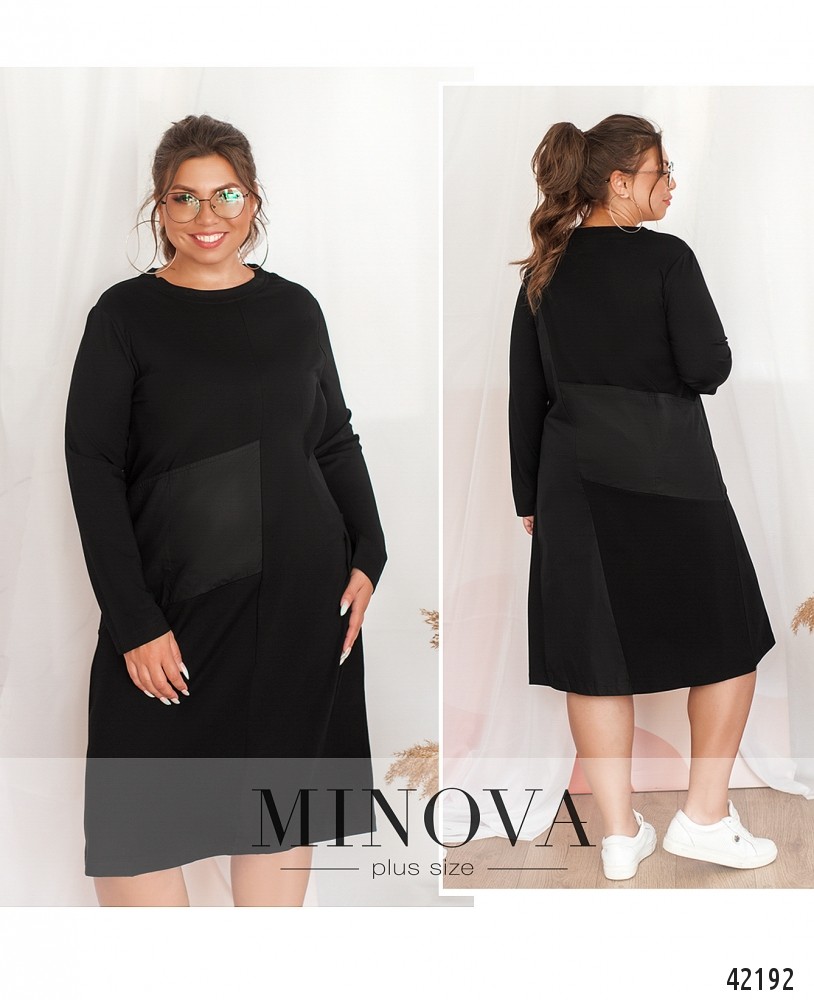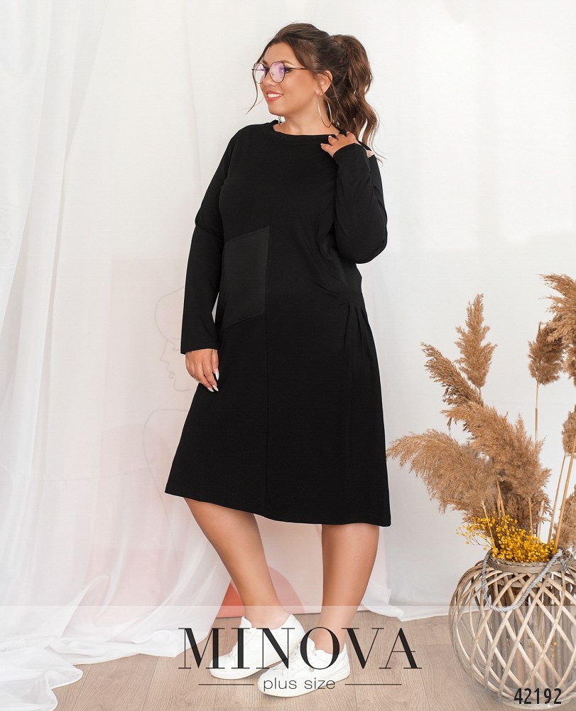 Элегантное платье батал без застёжек, справа - аппликации из другой ткани, выполняющие роль кармана. Рукава без манжет, вырез горловины полукруглый. Справа на боку ткань присобрана.