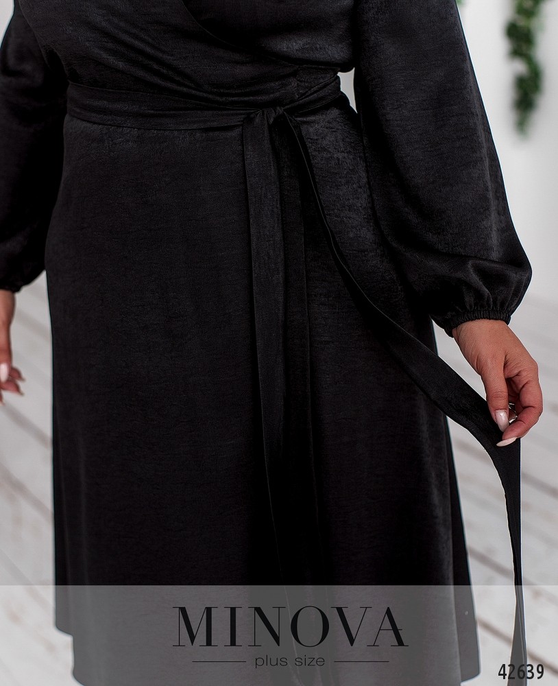 Элегантное платье большого размера на запАх, лента продевается в отверстие на талии и обёртывается вокруг пояса. Карманов нет. В рукава на запястьях вшиты резинки. На груди вытачки.