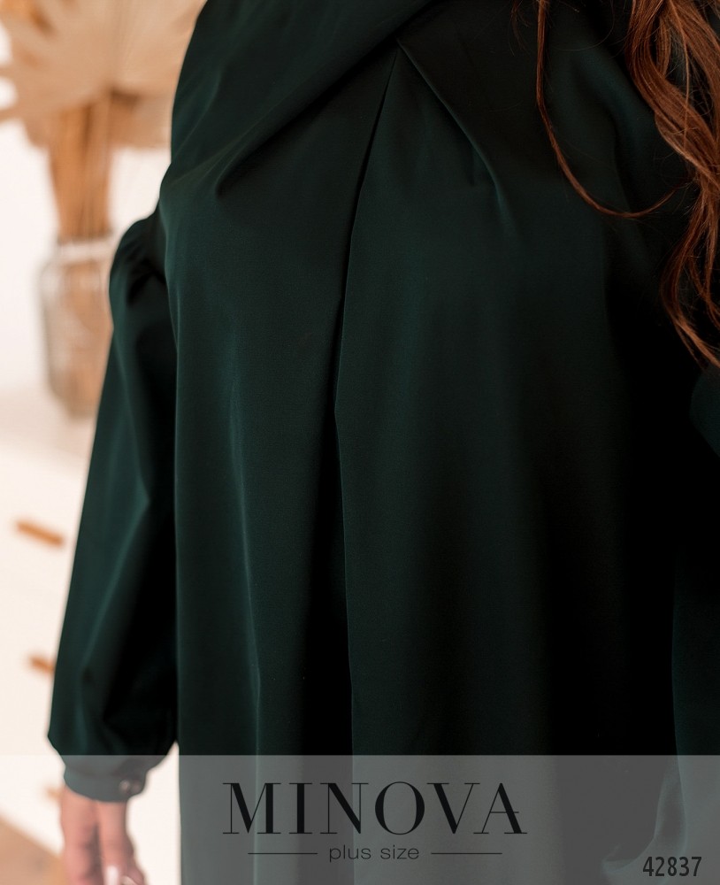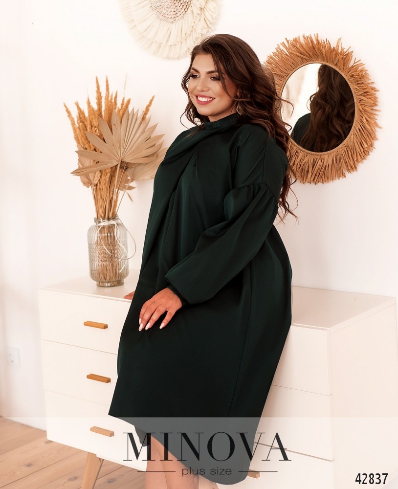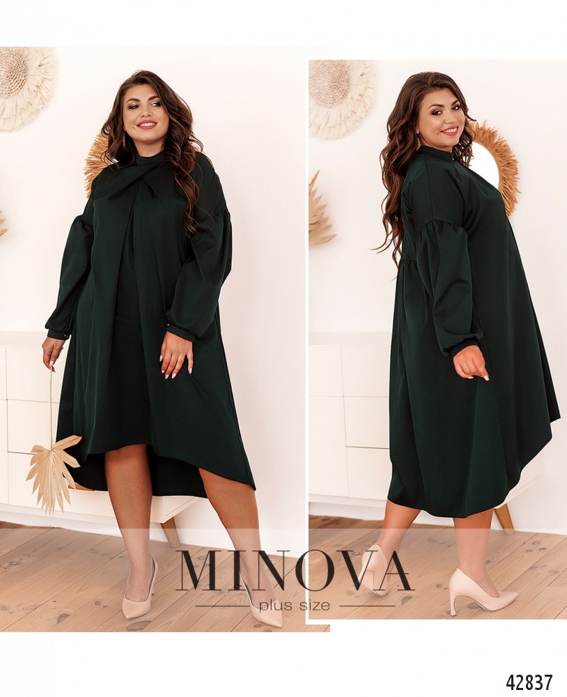 Оригинальное платье батал с присобранной под воротником-стоечкой тканью, расходящейся от груди. Рукава-буф, с небольшими манжетами, на манжетах по одной пуговице. Карманов нет. Ткань подола на спинке подшита к верху и расклешена. Подол асимметричный, по спинке длиннее. Украшение входит в комплект.