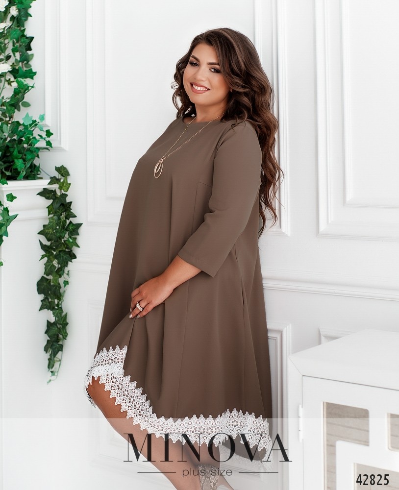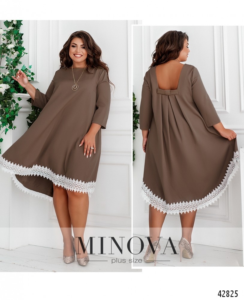 Романтичное платье плюс сайз, украшенное кружевом по подолу. На груди - вытачки, вырез горловины спереди полукруглый, по спинке - фигурный, с бантом и присобранной и расклешённой тканью. Рукава без манжет. Застёжек нет. По бокам - врезные карманы.