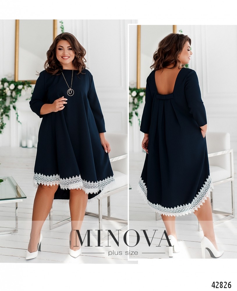 Романтичное платье плюс сайз, украшенное кружевом по подолу. На груди - вытачки, вырез горловины спереди полукруглый, по спинке - фигурный, с бантом и присобранной и расклешённой тканью. Рукава без манжет. Застёжек нет. По бокам - врезные карманы.