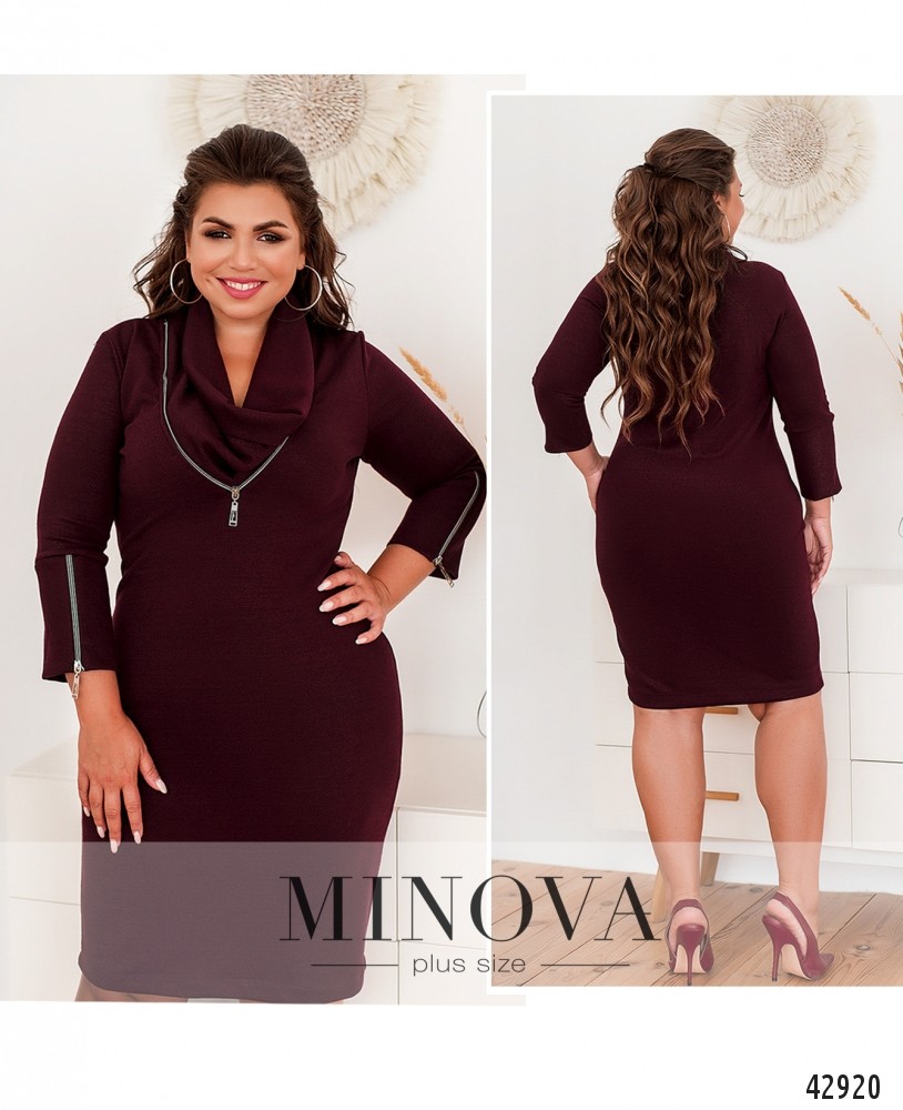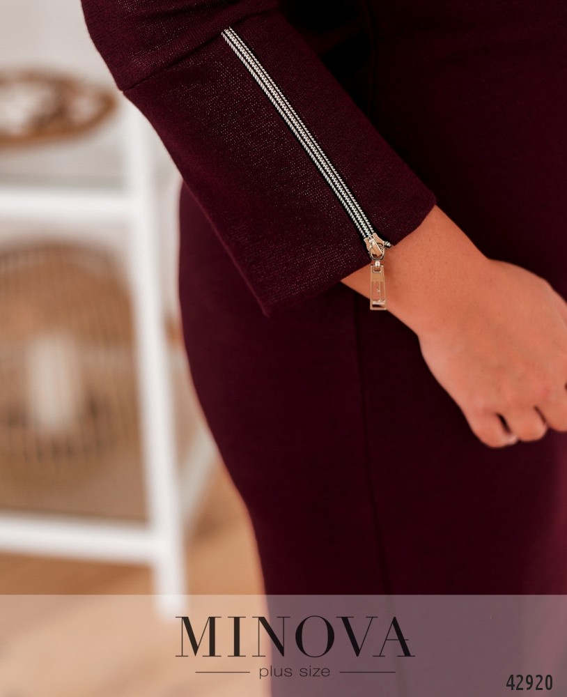 Удобное повседневное платье батал с рабочей молнией на груди и воротником-худи. На рукавах длинные манжеты, на них также молнии. Ткань с люрексом, изнутри гладкая. Карманов нет.