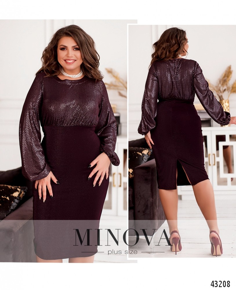 Яркое платье батал с лифом, украшенным пайетками. Рукава со вшитыми на запястьях резинками. Подол матовый, подшит к лифу. Застёжка - молния, вшитая по спинке. На подоле сзади шлица, силуэт приталенный. Карманов нет. Вырез горловины полукруглый.