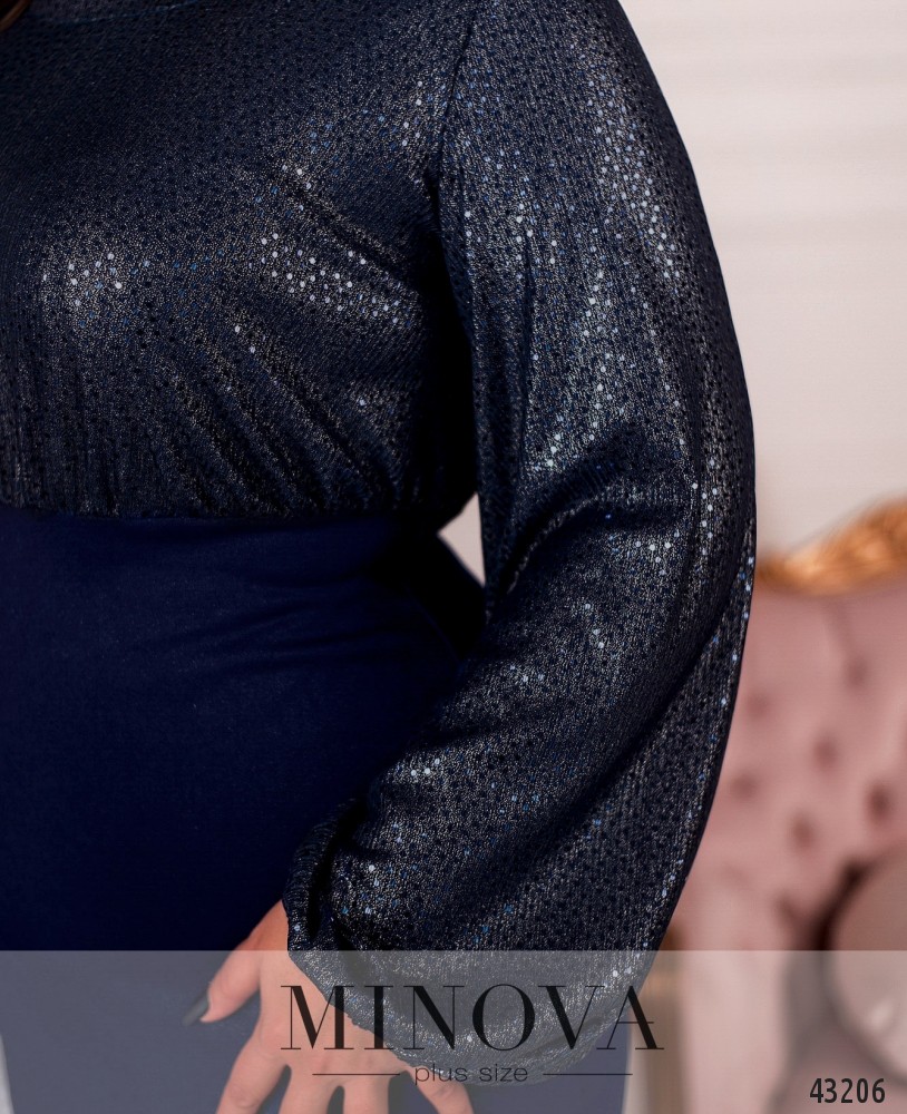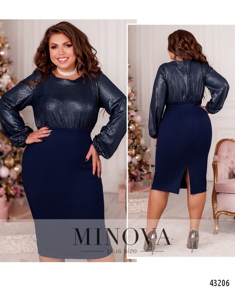 Яркое платье батал с лифом, украшенным пайетками. Рукава со вшитыми на запястьях резинками. Подол матовый, подшит к лифу. Застёжка - молния, вшитая по спинке. На подоле сзади шлица, силуэт приталенный. Карманов нет. Вырез горловины полукруглый.