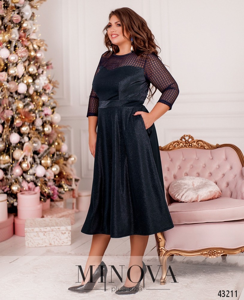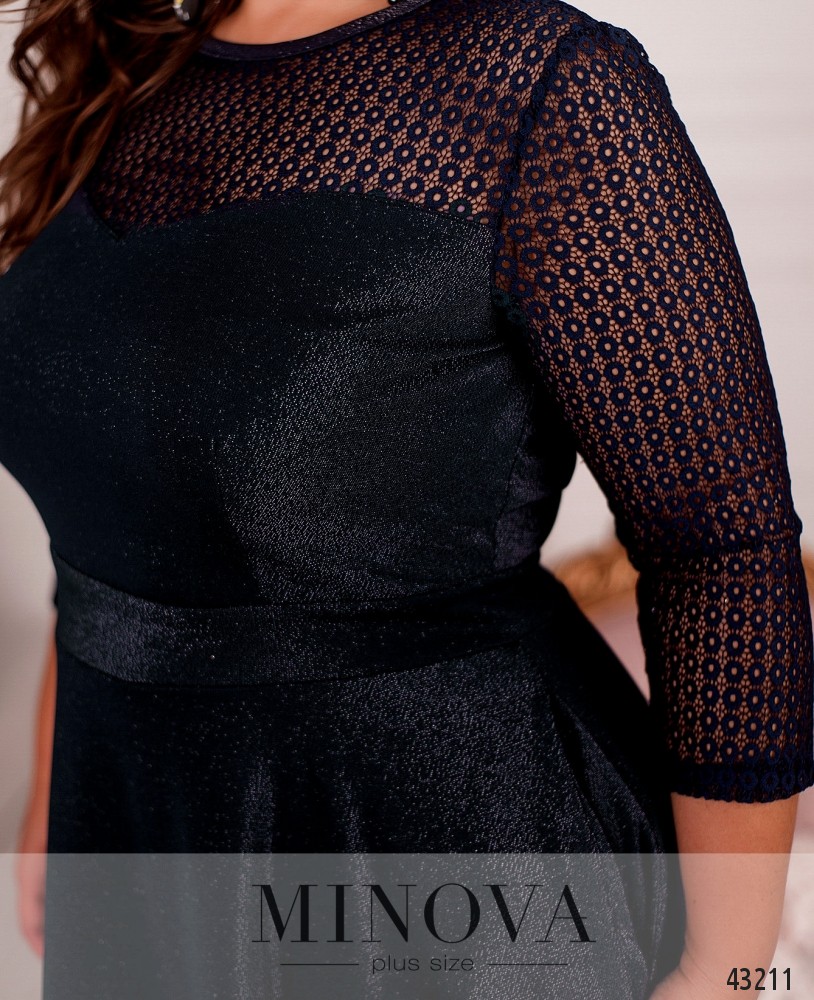 Элегантное платье батал с кружевным верхом и рукавами, рукава без манжет. Вырез плотной ткани в форме фигурного каре, вырез кружевной части - полукруглый. Подол подшит к лифу и отделён полосой "пояска". Ткань с люрексом, застёжка - молния, вшитая по спинке, по бокам - врезные карманы. На груди продольные вытачки.