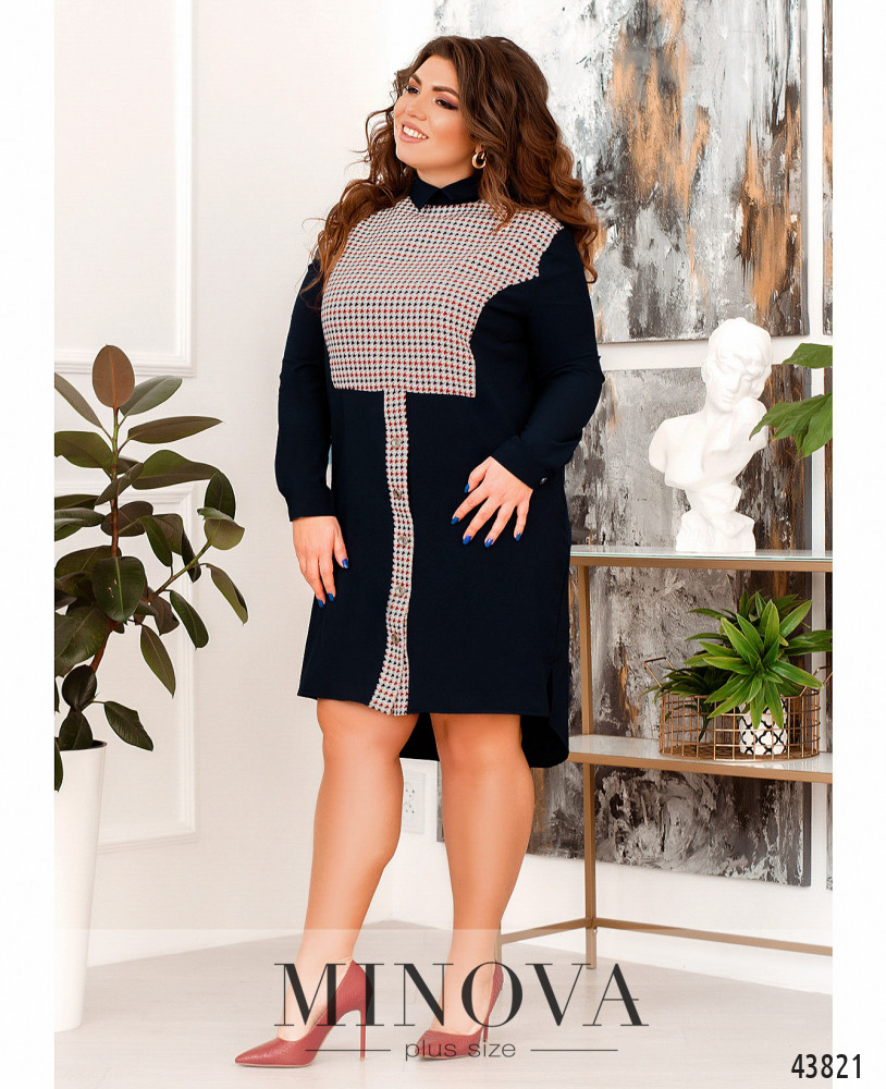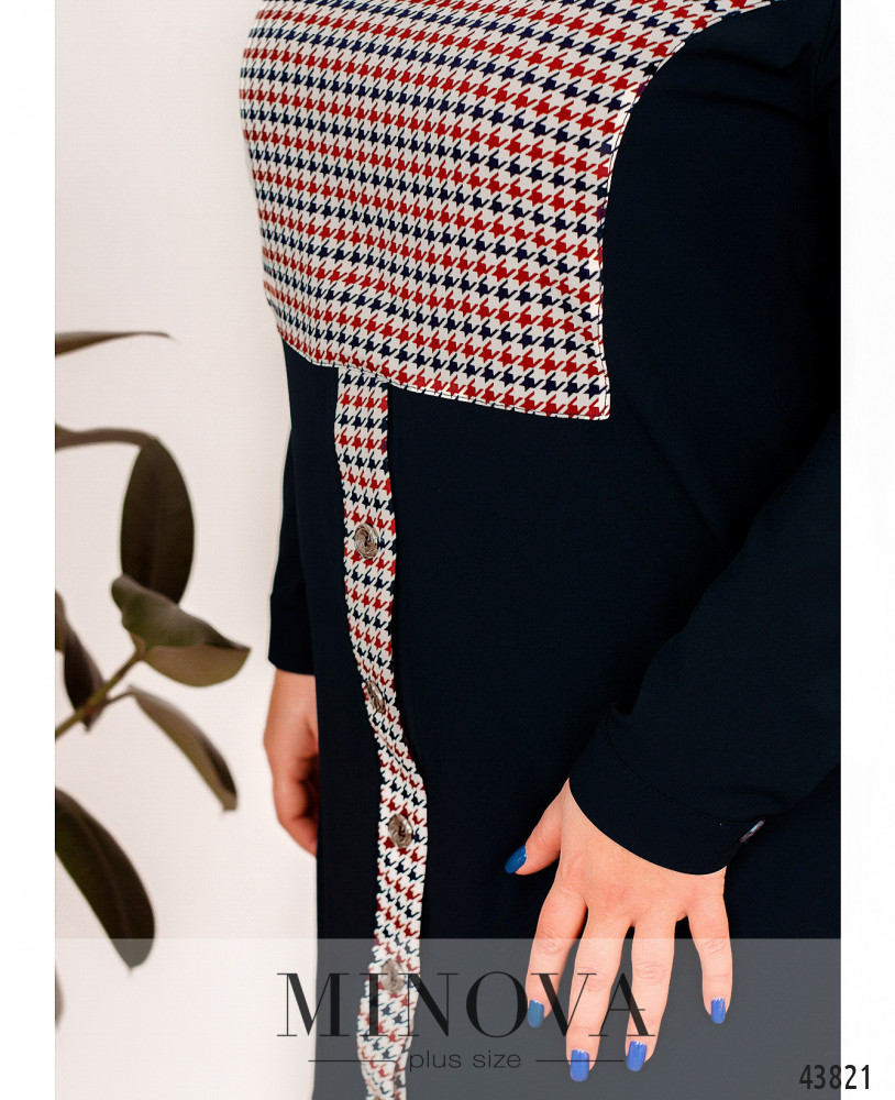 Привлекательное платье большого размера с однотонной спинкой и яркими вставками на лифе и подоле. Подол с декоративными пуговицами по центру на контрастной планке, сзади шлица. Карманов нет. Воротничок отложной, застёжка - пуговка сзади под шеей. На рукавах небольшие манжеты с одной пуговкой. По спинке кокетка с небольшими оборками.