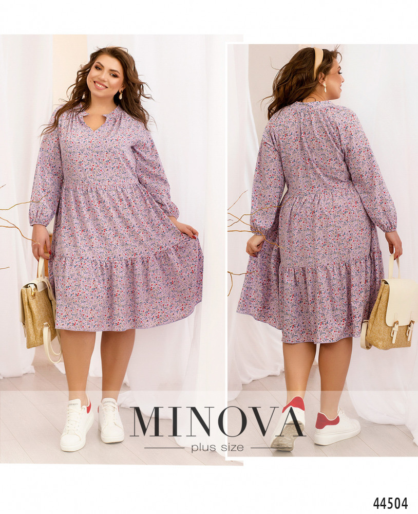 Стильное лёгкое платье плюс сайз без карманов и застёжек, воротник - небольшая "стоечка", под ним неглубокий вырез. В рукава на запястьях вшиты резинки. Платье без подкладки. Подол с несколькими рядами оборок.