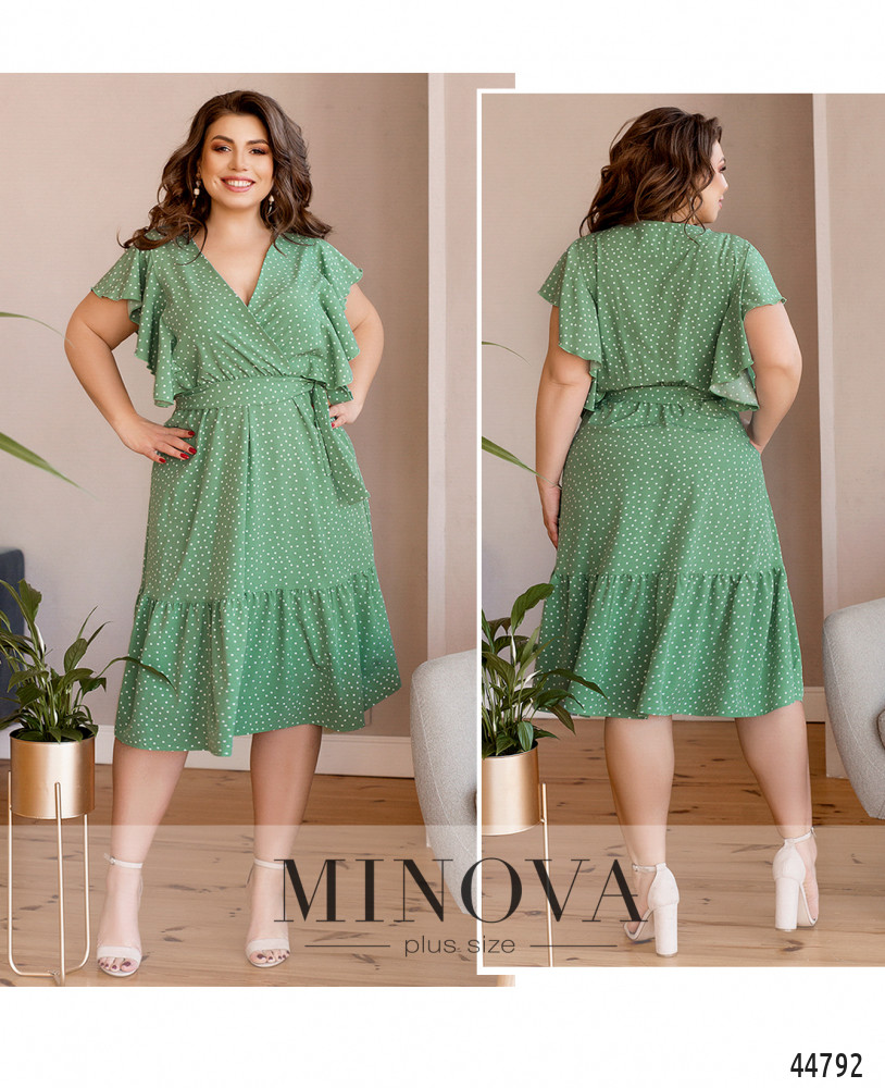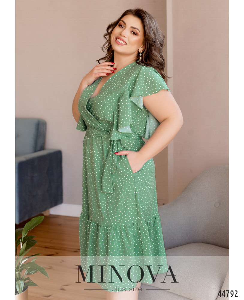 Стильное и элегантное платье батал, лиф подшит на запАх к подолу, в пояс вшита резинка, подол украшен оборками. Рукава - ниспадающие мягкие оборки-крылышки. По бокам - карманы в шве. В комплекте пояс в тон. Застёжек нет. Пояс/аксессуар входит в комплект.
