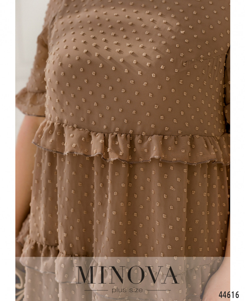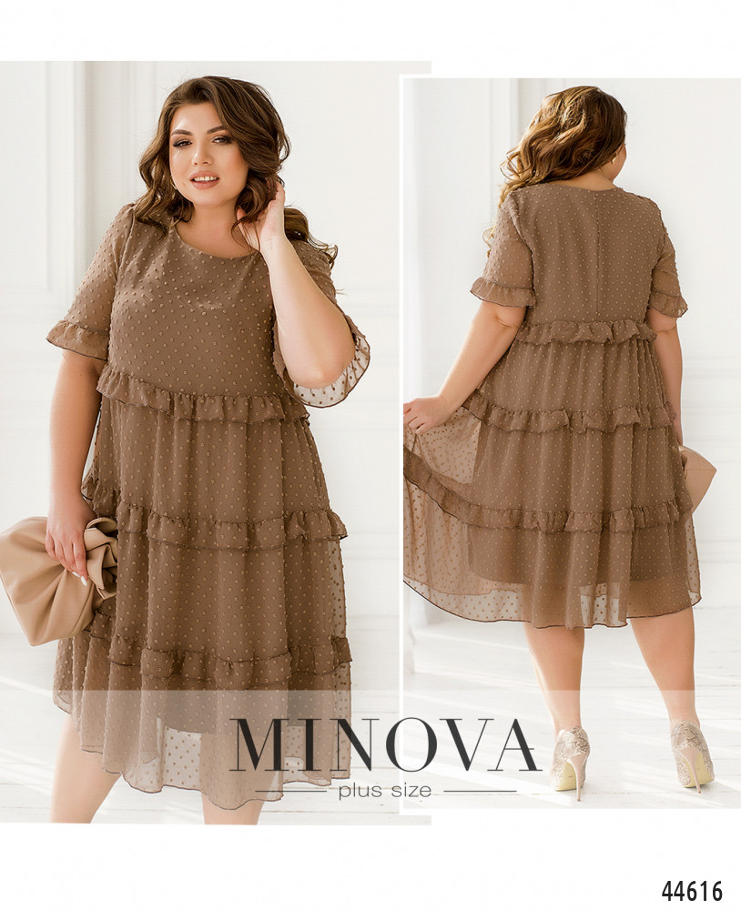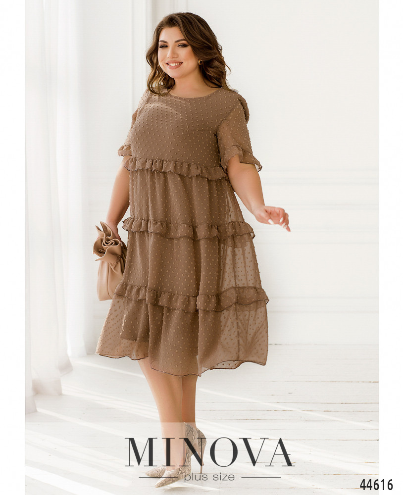 Нежное платье батал А-силуэта, без застёжек и карманов. Нижний слой мягкий, верхний - полупрозрачный, с несколькими рядами оборок. Рукава без подкладки, с оборками на месте манжет. Вырез горловины полукруглый.
