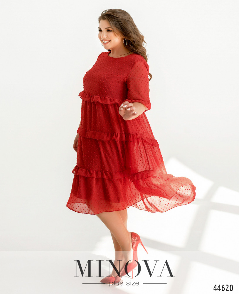 Нежное платье батал А-силуэта, без застёжек и карманов. Нижний слой мягкий, верхний - полупрозрачный, с несколькими рядами оборок. Рукава без подкладки, с оборками на месте манжет. Вырез горловины полукруглый.