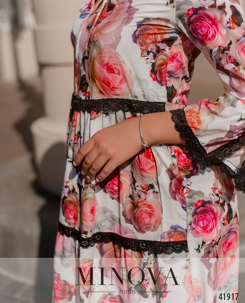 Изящное платье с кружевом на подоле и на талии. Завязывается на шнурки на воротнике. Застёжек и карманов нет. Рукава расклешены, с разрезом на манжетах, также украшены кружевом.