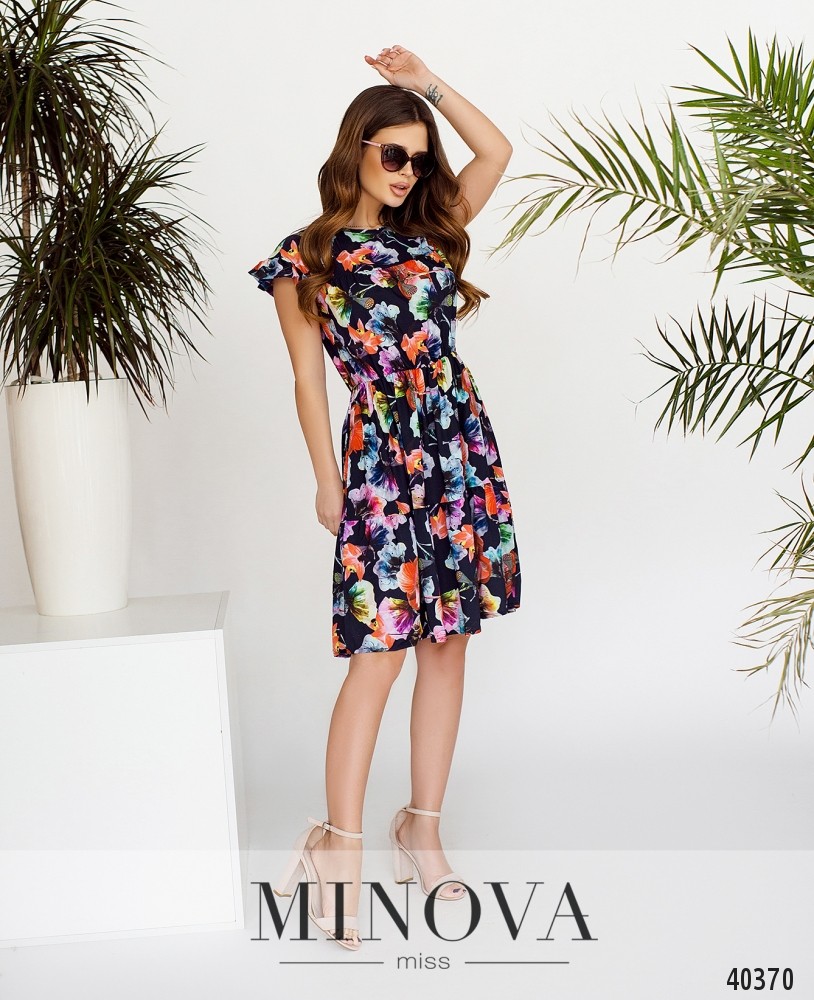 Нежное платье с ярким цветочным принтом, рукава-крылышки с оборками, подол подшит к верху и расклешён, верх также двусоставный, присобранный. Вырез горловины полукруглый. Без застёжек и карманов.