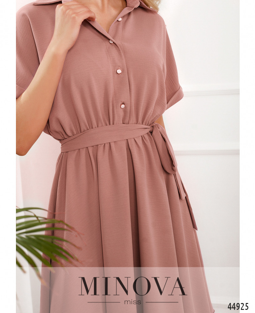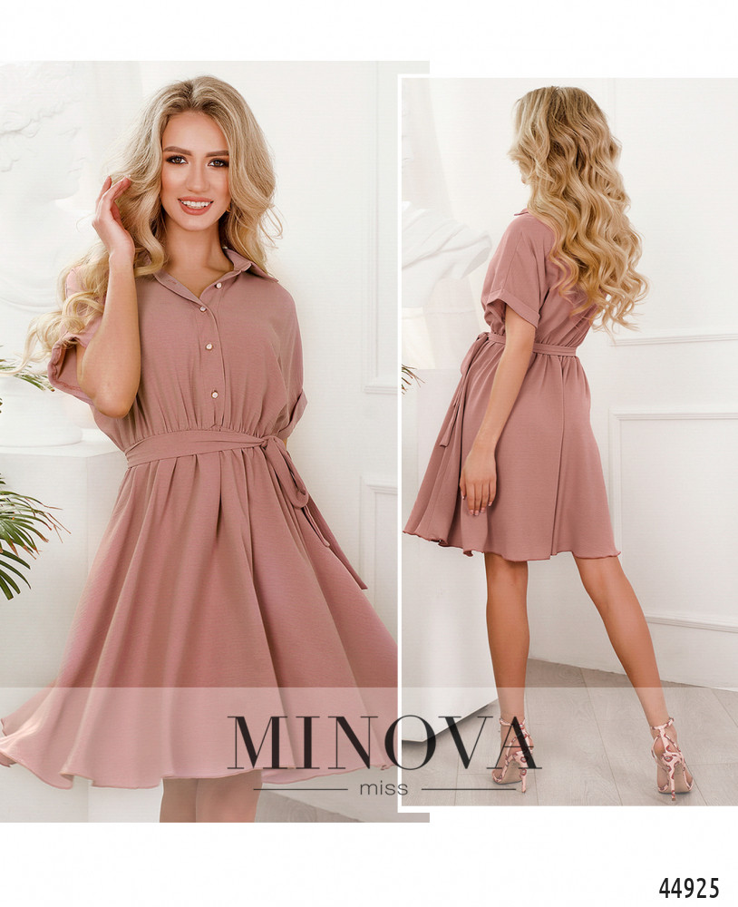 Элегантное минималистичное платье с отложным воротничком и рядом пуговиц спереди на планке до талии. Рукава короткие, с небольшим отворотом, фасона "летучая мышь". В пояс вшита резинка, подол ниспадает оборками, на лифе ткань также немного присобрана. Карманов нет.