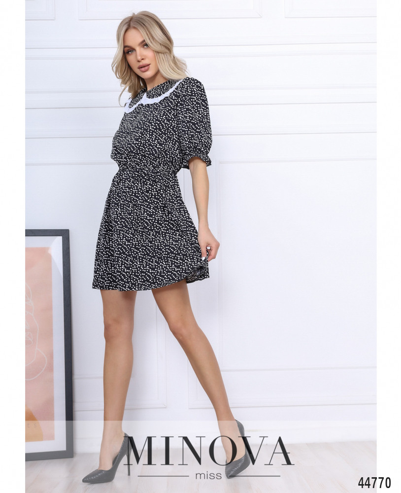 Элегантное платье в горошек с отложным воротничком, украшенным тесьмой. Рукава со вшитыми резинками и небольшими оборками. Карманов нет, застёжка - пуговка сзади под шеей. В талию вшита резинка.