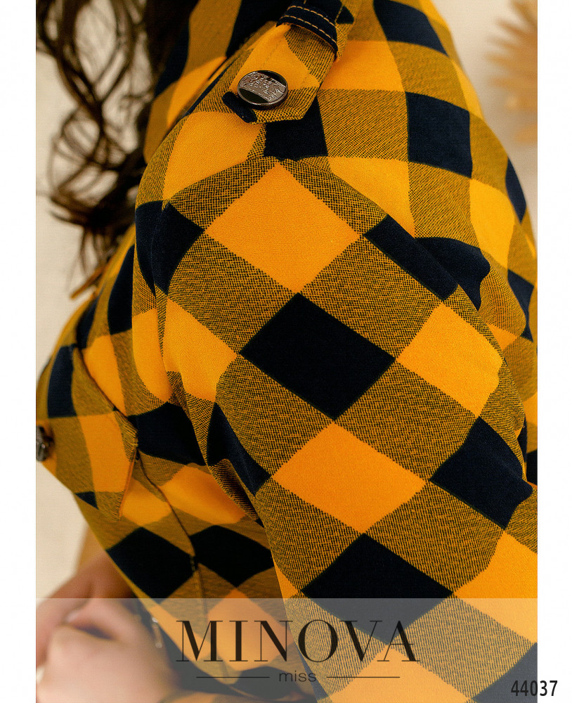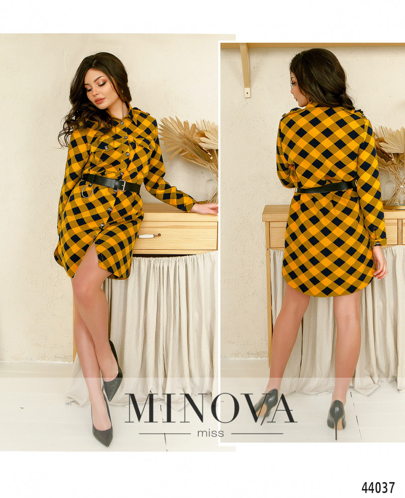Яркое платье с ремнём, в стиле "рубашки". Воротничок отложной, спереди на планке - ряд рабочих пуговиц. На плечах - небольшие декоративные погоны. По бокам подола - разрезы. На груди накладные карманы с пуговицами. Рукава с небольшими манжетами, на них по одной пуговке. На талии - шлейки для ремня.