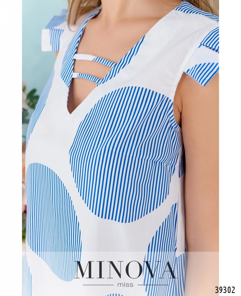 Милое платье-сарафан с плотными оборками, прикрывающими плечи. Вырез декольте V-образный, с двумя поперечными лентами, на груди вытачки, карманов и застёжек нет. К подолу подшиты оборки.
