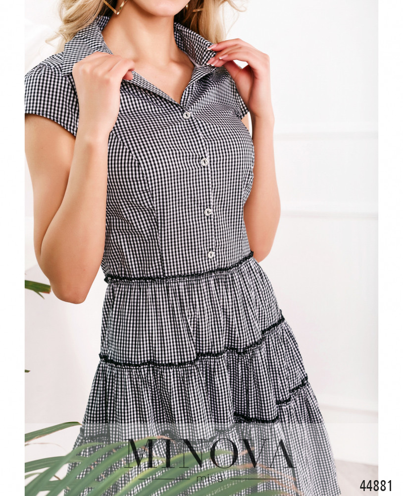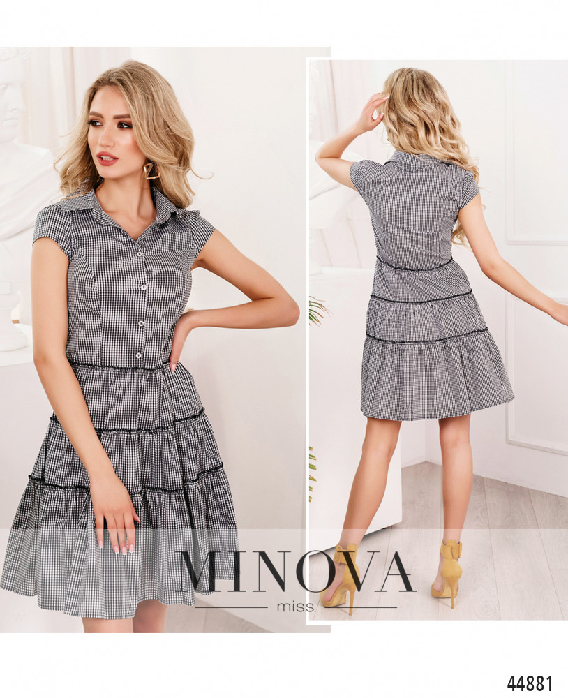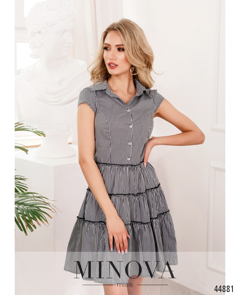 Привлекательное платье с отложным воротничком и рядом пуговиц спереди на планке от воротничка до талии. Слева от подмышки до талии - вшитая потайная змейка. Подол с тремя подшитыми рядами оборок. Карманов нет. Рукава-лепестки. На груди скульптурирующие вытачки.