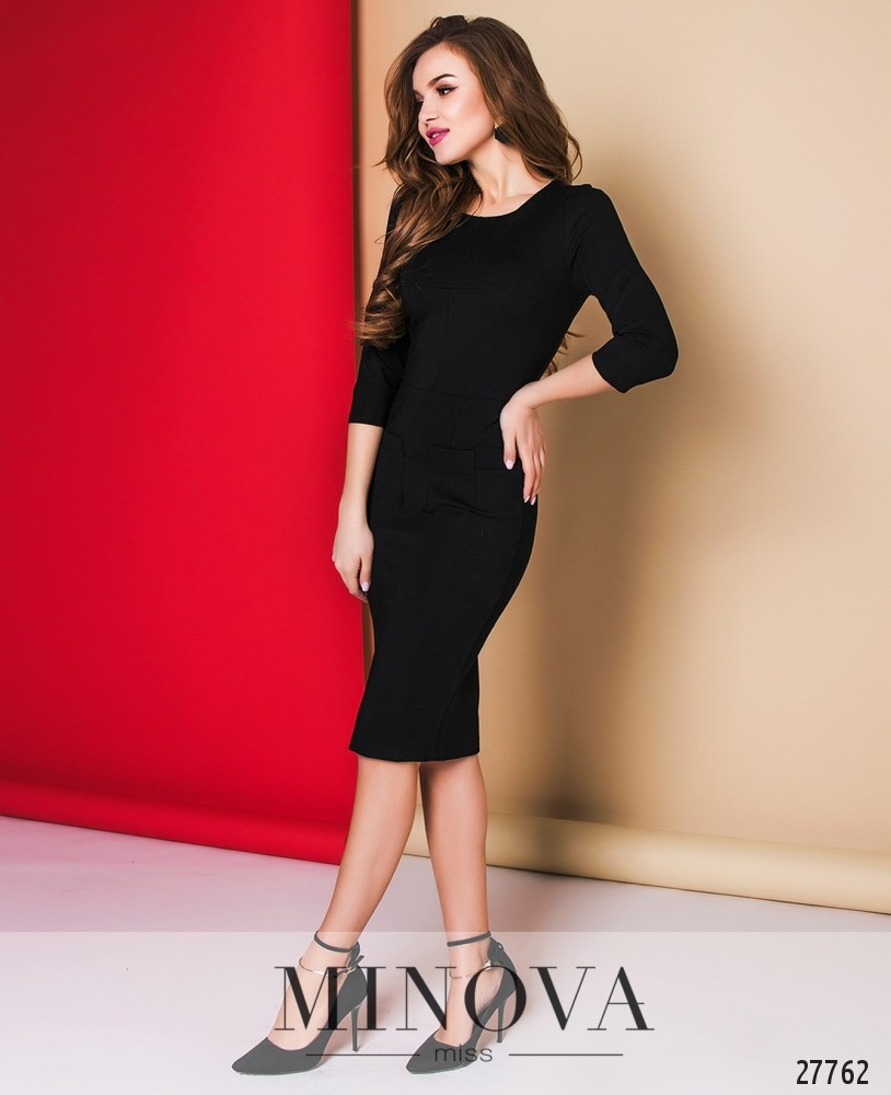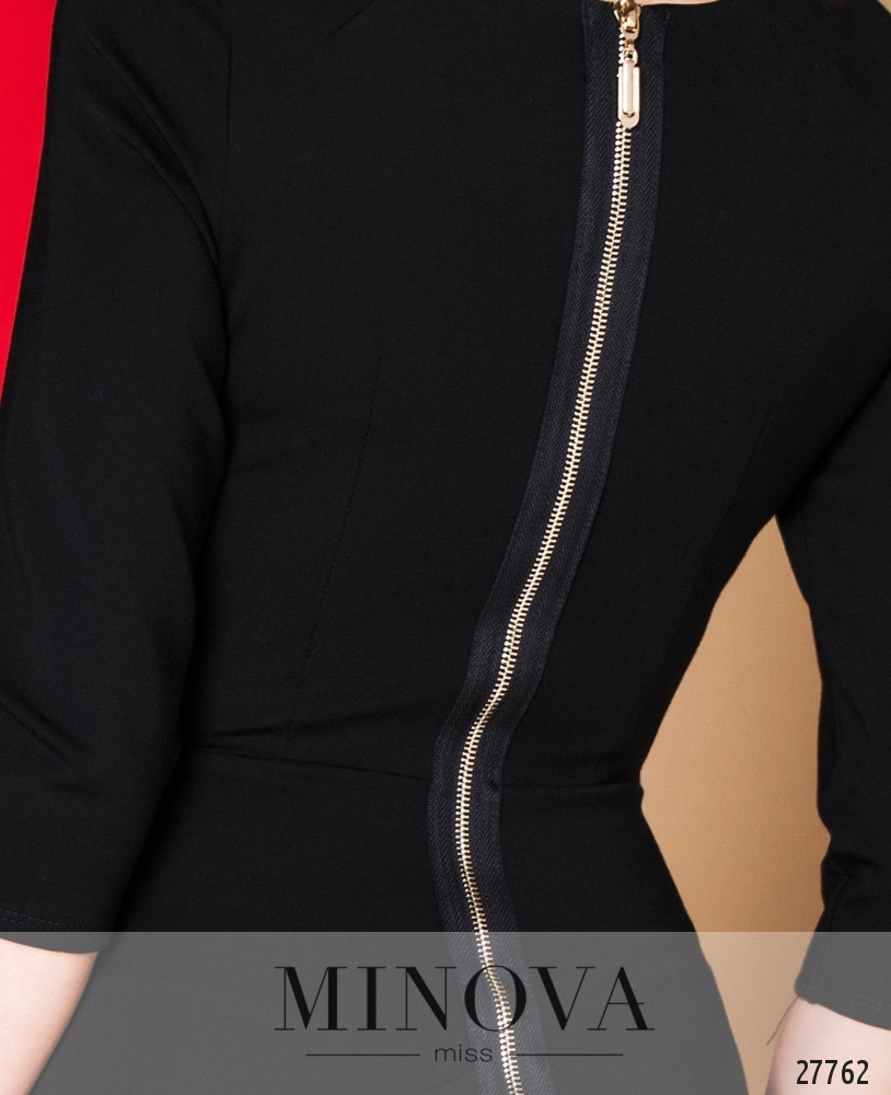 Платье – футляр с рукавами ¾ и фактурной молнией на спине. Платье отрезное от груди и от талии.Лицевая сторона украшена защипами.