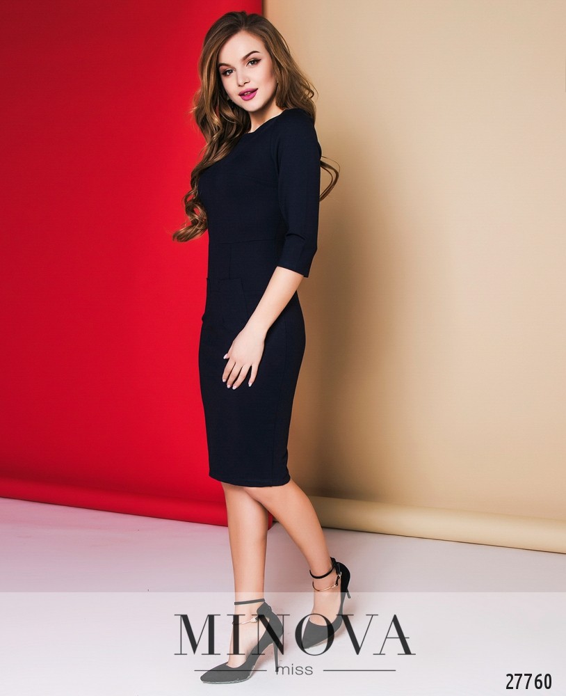 Платье – футляр с рукавами ¾ и фактурной молнией на спине. Платье отрезное от груди и от талии.Лицевая сторона украшена защипами.