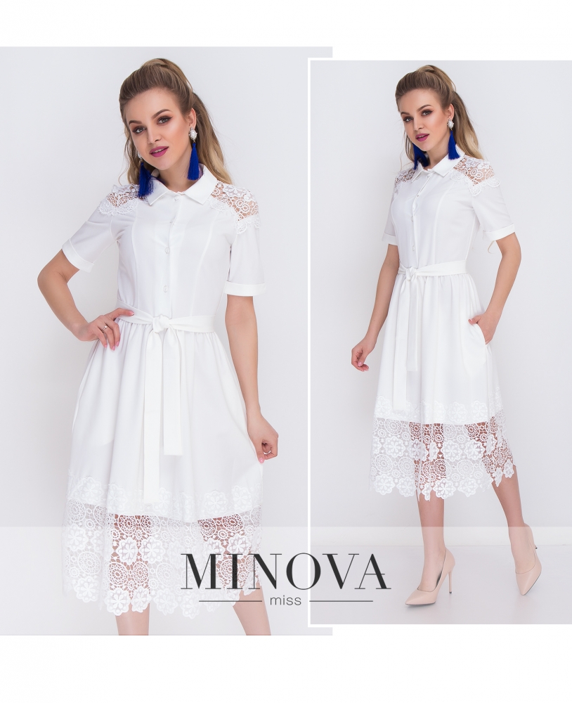 Нарядное платье-рубашка со съемным поясом и расклешенной юбкой. Лиф и ворот платья застегивается на пуговицы. Плечи подчеркнуты прозрачным кружевом. Короткие рукава подвернуты в манжеты. Отрезной от талии подол дополнен широким фактурным кружевом.