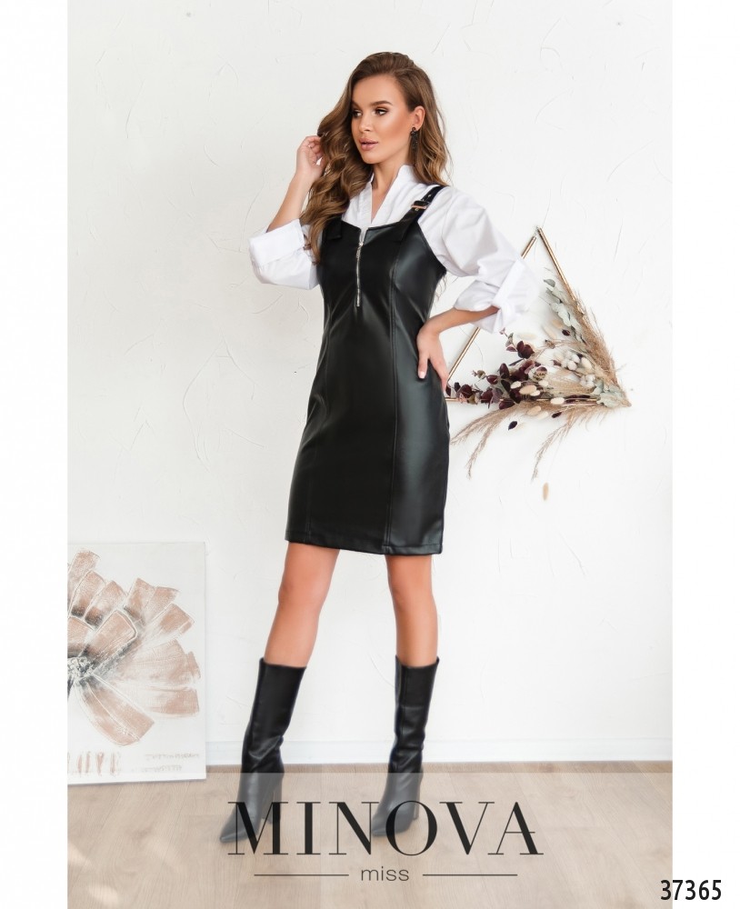 Приталенное платье-сарафан из эко-кожи. Лямки регулируются небольшой пряжкой, спереди на груди рабочая змейка, слева – потайная молния. Спереди и сзади – длинные продольные вытачки. Карманов нет.