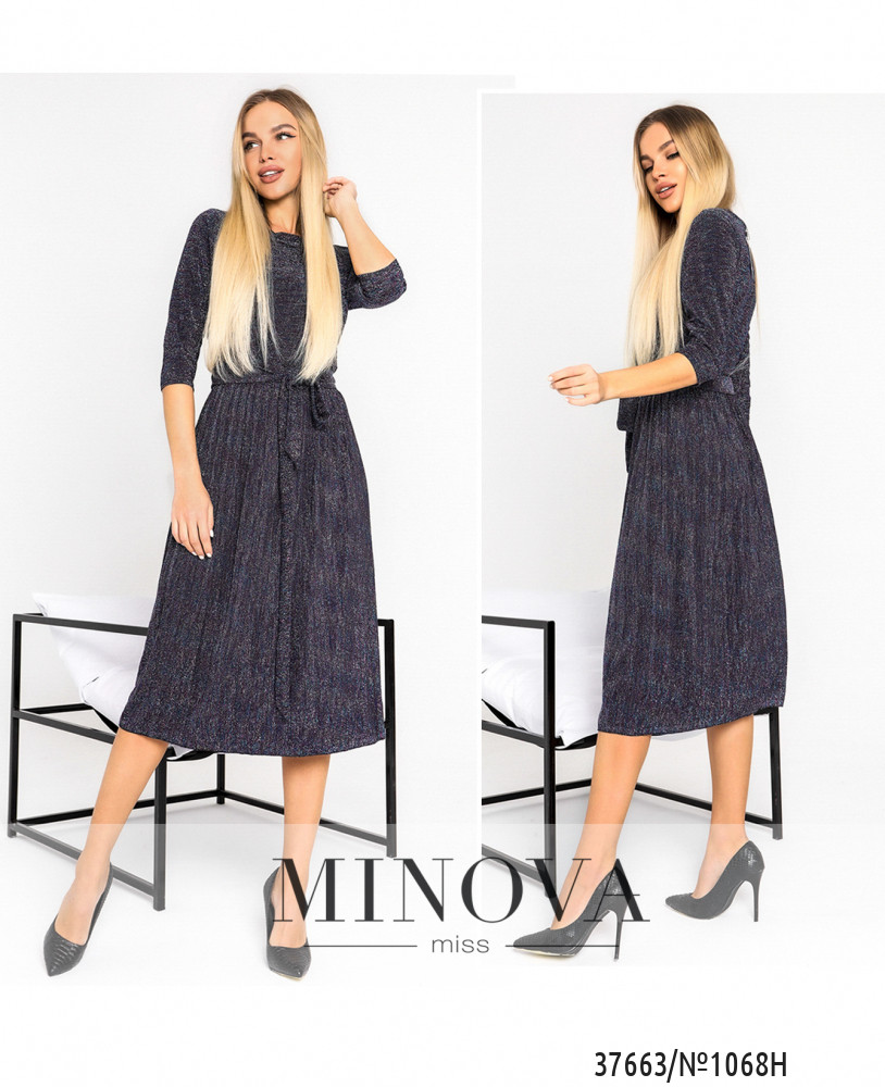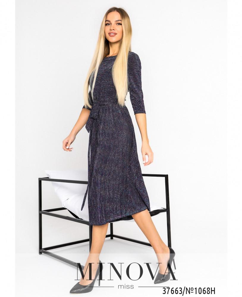 Элегантное нарядное платье с люрексом и плиссированным подолом. В комплекте пояс. Вырез горловины широкий, полукруглый, застёжек и карманов нет, рукава без манжет. Пояс/аксессуар входит в комплект.