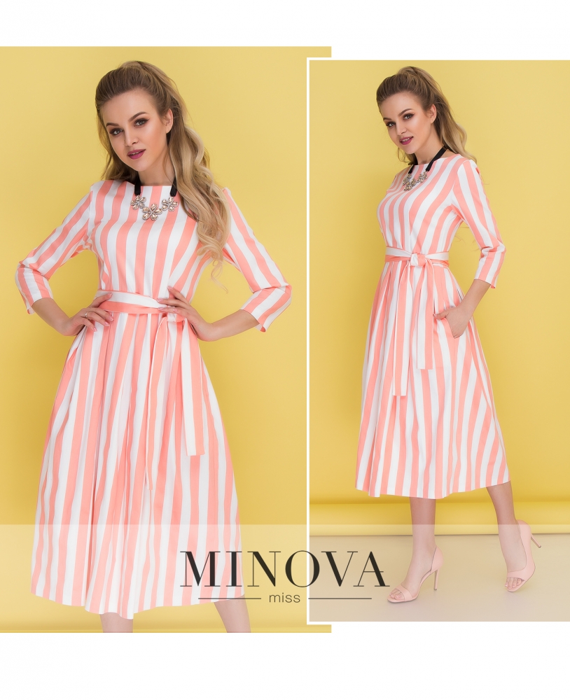 Яркое полосатое платье с поясом, подол подшит к лифу и присобран оборками. Застёжка - вшитая по спинке потайная молния. По бокам - врезные карманы. Рукава короткие, без манжет.