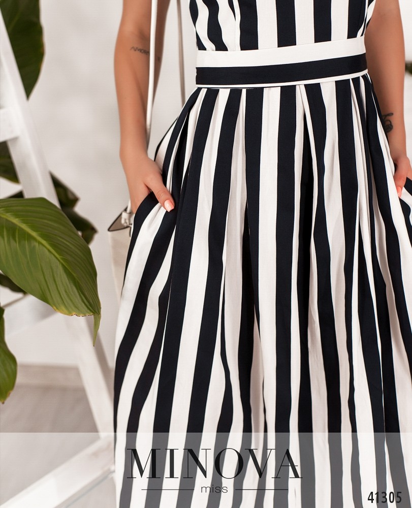 Яркое полосатое платье с поясом, подол подшит к лифу и присобран оборками. Застёжка - вшитая по спинке потайная молния. По бокам - врезные карманы. Рукава короткие, без манжет.