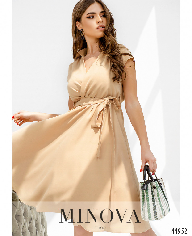 Элегантное платье с глубоким декольте и подшитым на запАх лифом, воротничок отложной, на спинке под воротничком - V-образный вырез. Лиф с подшитой подкладкой. В пояс вшита резинка, подол ниспадает мягкими оборками. На талии шлейки для пояса. Рукава-крылышки без манжет. Застёжек и карманов нет.