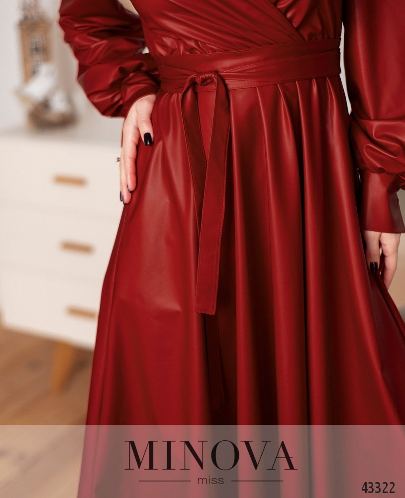 Оригинальное платье со вставкой резинки на поясе. Декольте V-образное, лиф на запАх с обеих сторон, двуслойный: изнутри подшита мягкая подкладка. Ткань подола также изнутри мягкая. Данная ткань (тонкая экокожа) интенсивно пропускает воздух и приятная к телу. Отложной воротничок, по спинке под ним вырез. В наличии пояс. Рукава с манжетами, на манжетах по одной пуговице. По бокам - врезные карманы, застёжек нет.
